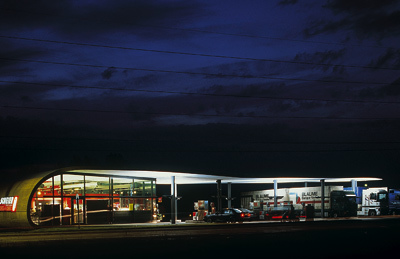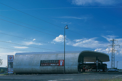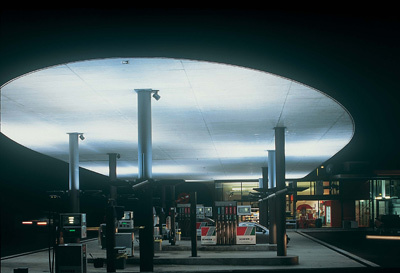 Alle weiteren baulichen Ergänzungen sind so zurückhaltend wie möglich, um die Klarheit der Struktur zu unterstreichen. Die indirekte Beleuchtung im Betankungsbereich und im Shop lassen das Dach bei Nacht scheinbar schweben. Das kräftige Rot im Shop zusammen mit der schwarzen Einrichtung erzeugen eine anregende Atmosphäre. (Text: Architekten)