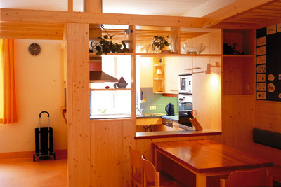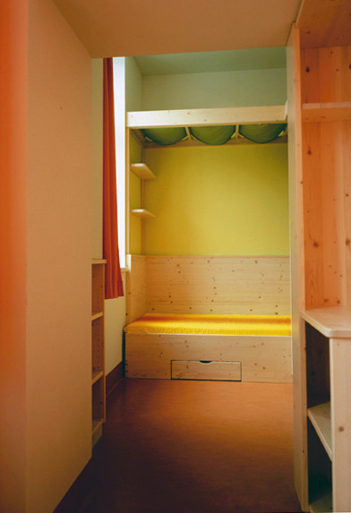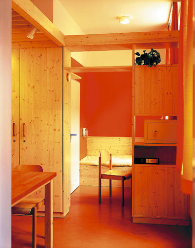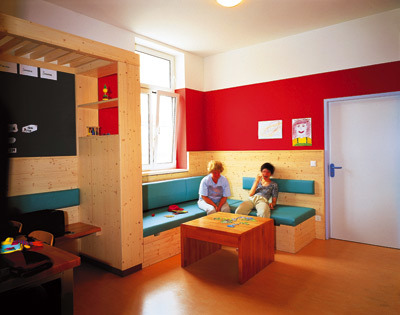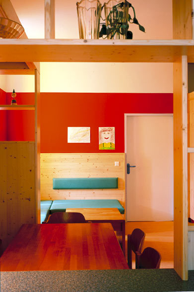 Thomas Abendroth hat das Thema des behindertengerechten Wohnens intensiv reflektiert und mit einprägsamen, im Grunde sehr einfachen Mitteln auf die speziellen Anforderungen reagiert. Wärmende Farben, eine „einleuchtende“ Tageslichtführung sowie die wohnliche Raumakustik sind bei dieser fest mit dem Raum verankerten Einrichtung ebenso maßgeblich wie die ausschließliche Verwendung von Vollholz. Dazu der Architekt: „Das Holz fühlt sich warm an und riecht gut. Spuren von Abnutzung und Vandalismus bleiben gering und lassen sich wieder beheben.“ Auf ein ausgewogenes Verhältnis zwischen Gruppen- und Rückzugsräumen wurde großer Wert gelegt, um das soziale Verhalten ebenso zu fördern wie die Wertschätzung der Bedürfnisse einzelner. Dieser räumlich stimulierte heilpädagogische Ansatz kommt letztlich allen in der Gruppe zugute: Den Bewohnern ebenso wie ihren Betreuern. (Text: Gabriele Kaiser)
