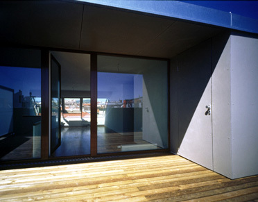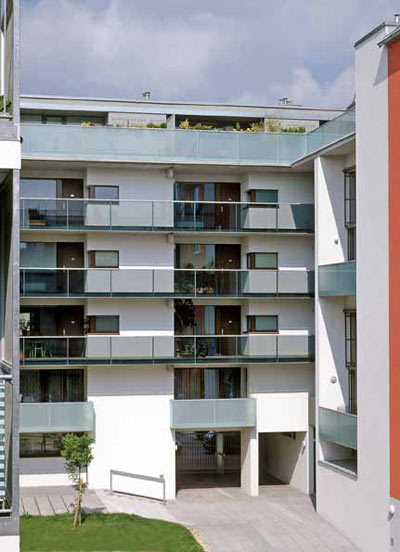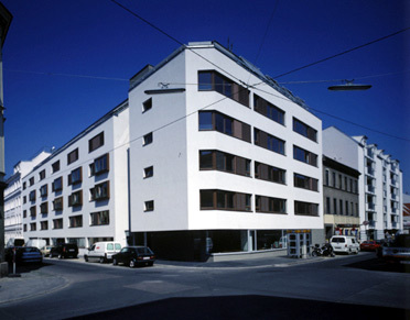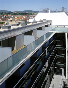 Die rauchglasverbrüsteten Laubengänge werden durch wohnungsweise Rücksprünge punktuell breiter, bilden eine Art Vorplatz mit halböffentlichen Charakter. Die Dachgeschossmaisonetten verfügen über Terrassen samt praktikablem Außenabstellraum. Die Typenvielfalt suggeriert eine entsprechende Vielfalt in der Bewohnerstruktur, das sachliche Konstruktionsraster versteht sich als „ausbaufähiger“ Rahmen des alltäglichen Lebens. (Text: Gabriele Kaiser)