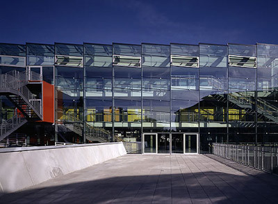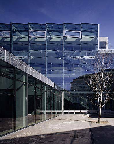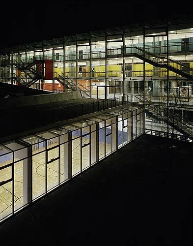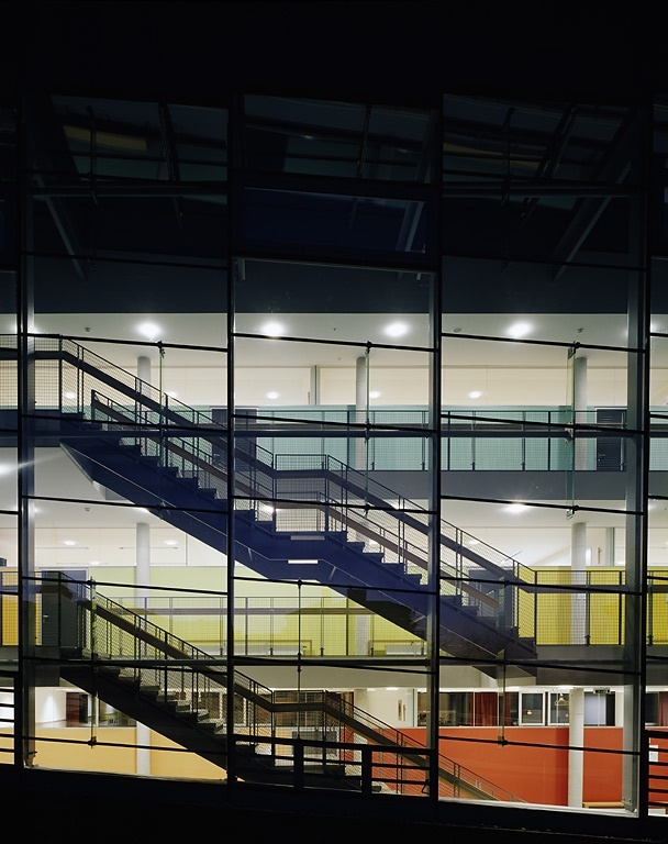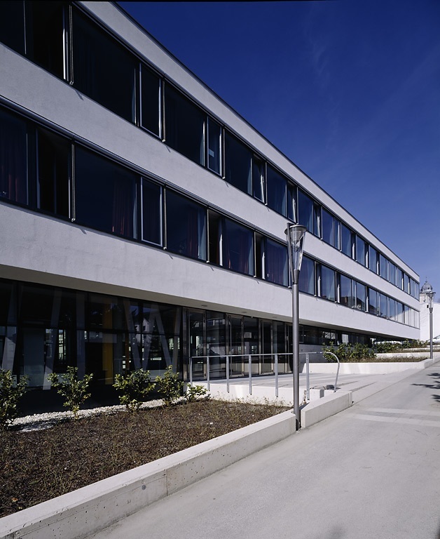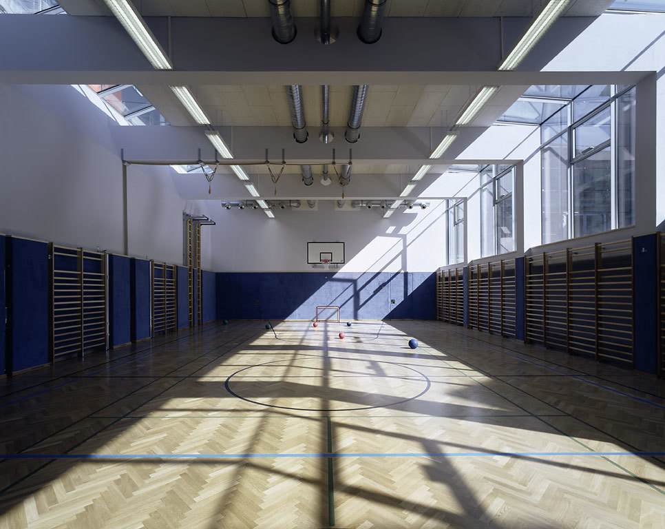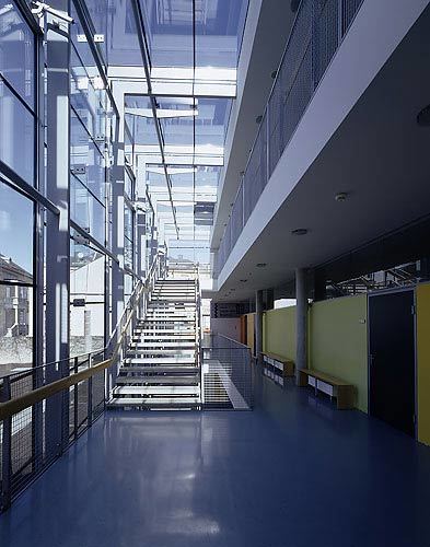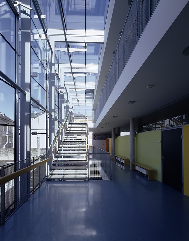 Der formal in keiner Weise mit dem Bestand kokettierende Neubau steht als langerstrecktes lichtdurchlässiges Band an der Schulgasse, gibt dem neuen Haupteingang der HBLA/FW eine eindeutige Fassung. Dazu die Architekten: „Wichtig war es uns, lichtdurchflutete, freundliche Unterrichtsräume und einen spannenden Verkehrs- und Aufenthaltsbereich zu schaffen.“ Dass die Gasse als fußläufige Nord-Süd-Verbindung und Weg zu Hauptschule und Sportplatz zusätzlich für die ganze Stadt aufgewertet wurde, ist ein zusätzlicher Gewinn. Die Unterrichtsräume der einhüftigen Anlage sind zur Schulgasse hin, also ostwärts orientiert, im Westen bestimmt die verglaste viergeschossige Aufschließungshalle mit ihren Treppenkaskaden und Stegen die Front. Der neue abgesenkte Turnsaal für die Volksschule mit ebenfalls verglaster Seite zum Hof überbrückt den Geländesprung, die Dachterrasse zieht den Eingangsbereich weit in die Tiefe. (Text: Gabriele Kaiser)