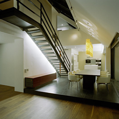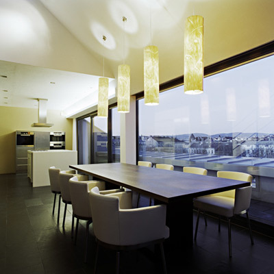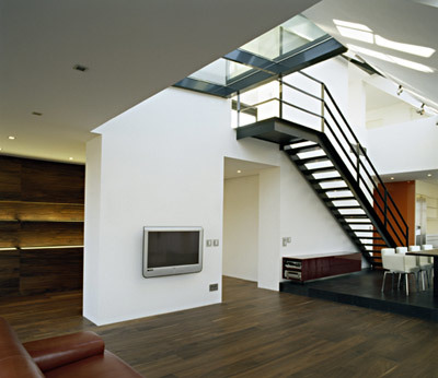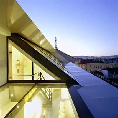 Die einzuhaltende Dachneigung und Traufhöhe bildeten die Fixpunkte für eine in gestalterische Hinsicht ansonsten sehr freie Planung. Einsichtnahme durch neugierige Nachbarn ist hier oben nicht zu befürchten: Drei tragende Stahlrahmen bilden das konstruktive Gerüst, das mit Glas- und Aluminiumflächen ausgefacht eine sehr luftige Dachlandschaft formt und den Kahlenbergblick einerseits, den Cityblick andererseits mit Leichtigkeit in Szene setzt. Über dem U-förmigen Wohngeschoss thront ein „abgehobenes“, von einer geräumigen Panoramaterrasse umfasstes Studio, das seinen Bewohnern das Hochgefühl bescheren mag, die ganze Stadt läge ihnen zu Füßen. (Text: Gabriele Kaiser)