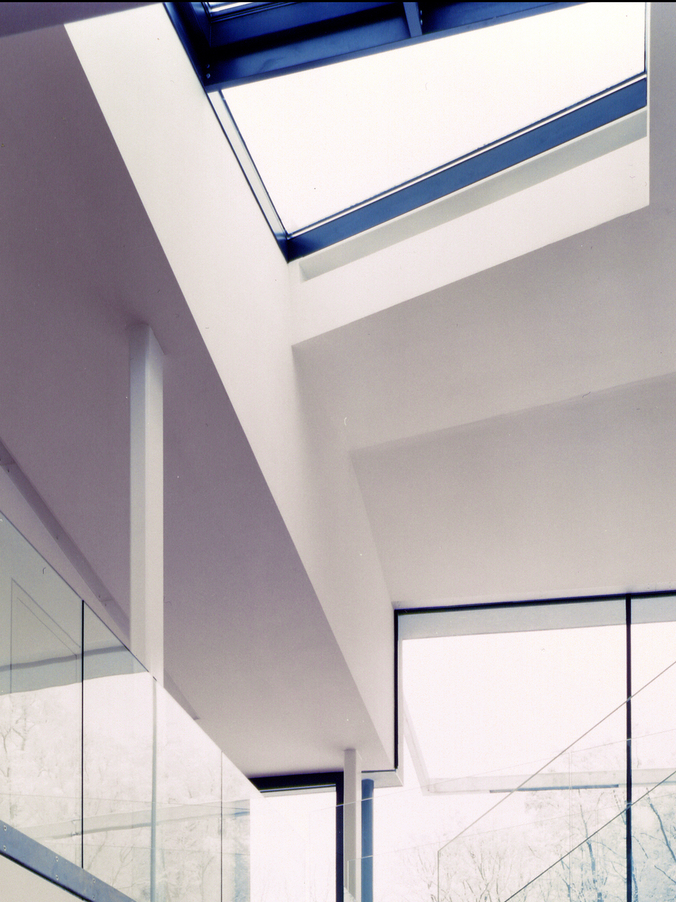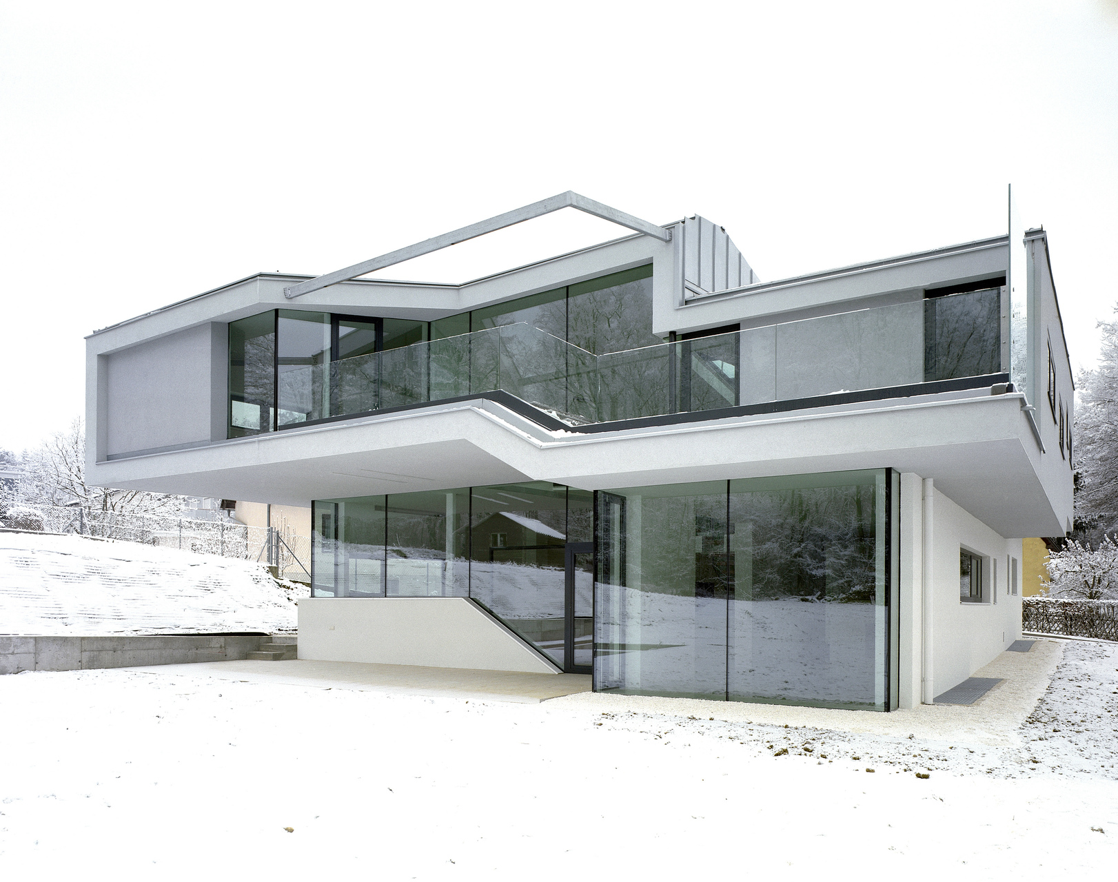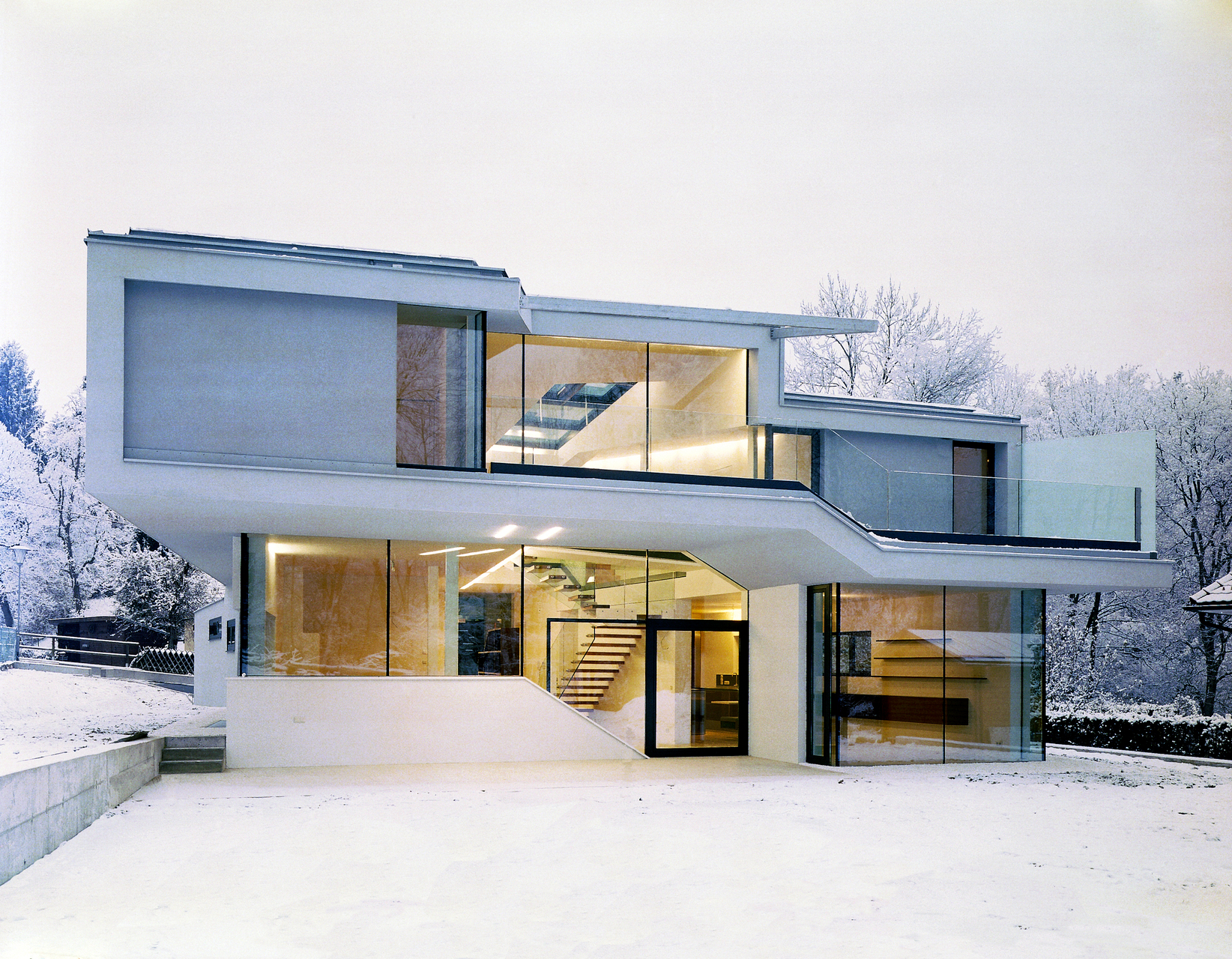 Dieses Ineinanderübergehen der Raumfolgen wird durch die spezielle Lichtführung begünstigt, die mit den konventionellen Schablonen von Wand und Öffnung nichts mehr gemein hat. Die „schwebenden“ Trittstufen der offenen Stiegen blockieren den Raumfluss nicht, integrieren die von oben belichtete Erschließungsmitte in den Verteilerkreis des Wohngefüges, das zwischen Elterntrakt und Kindertrakt eine deutliche Zäsur setzt. Trotz zahlreicher Faltungen bleibt der rektanguläre Zuschnitt der Zimmer weitgehend gewahrt, um nutzlose Zuspitzungen und unbewältige Restflächen zu vermeiden: Im Spannungsbogen der räumlichen Komplexion hat gerade auch das Selbstverständliche seinen Platz. In der Dachlandschaft (Satteldach und Pultdach falten sich ineinander) ist der räumliche Bewegungsfluss zwischen den Baugliedern ablesbar. Panzerglasscheiben machen aus dem bewegten und durchlässigen Haus gleichsam eine sichere Festung. (Text: Gabriele Kaiser)