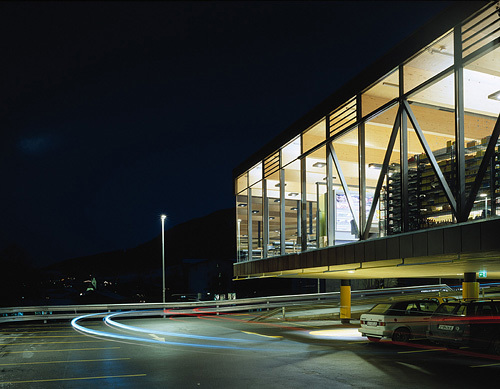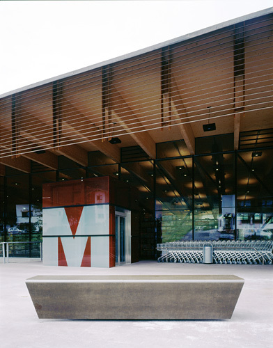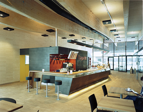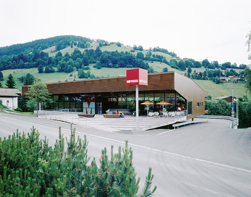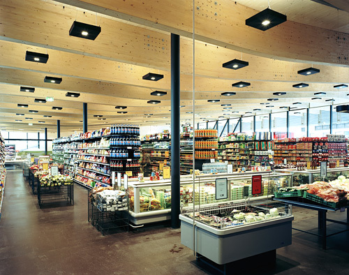 Der Geländefluß ist im gesamten Baukörper aufgenommen und in jedem Geschoss erlebbar. Einerseits fließt das Gelände unterhalb des Marktes spürbar im Parkdeck durch, andererseits nimmt die Dachkonstruktion das Umgebungsgelände auf und bietet zusätzlich im Marktinnenraum durch variierende Raumhöhen ein differenziertes Raumgefühl mit verschiedenen Zonierungen. (nach einem Text der Architekt:innen)