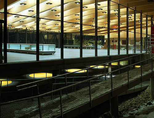 Der große überdachte Vorplatz – eine geknickte Betonplatte, die als Art Brücke vom Markteingang zur Landstraße hin gespannt ist – entstand aus der Notwendigkeit, den Niveauunterschied als Fußgänger überwinden zu können. Gleichzeitig dient der damit entstandene, großteils überdachte Vorplatz als Kommunikationsplatz, Caféterrasse und Kinderspielplatz.