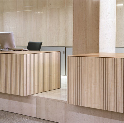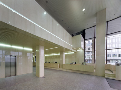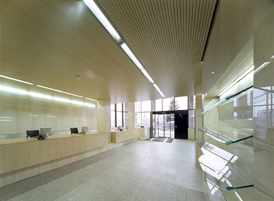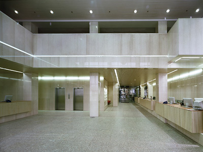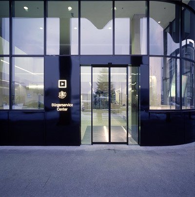 Das rund 220 m² umfassende Service-Zentrum mit eigenem Eingang bietet im übersichtlichen Großraum sofortige Übersicht und leichte Orientierung. Die Umgestaltung, das zeitgemäße Ambiente des Front-Office gerät mit der vorhandenen Architektur (das Neue Rathaus wurde 1979–85 nach einem Entwurf von Rupert Falkner errichtet) in keinen ästhetischen Konflikt, doch sie erweist sich als klärend, aufhellend und „motiviert“. Die Integration der Pulte in die Geometrie der Stützenstellung und eine geradlinige Lichtführung sorgen für einen stimmigen Gesamteindruck – sodass unbürokratischen „Amtshandlungen“ nichts im Wege steht.