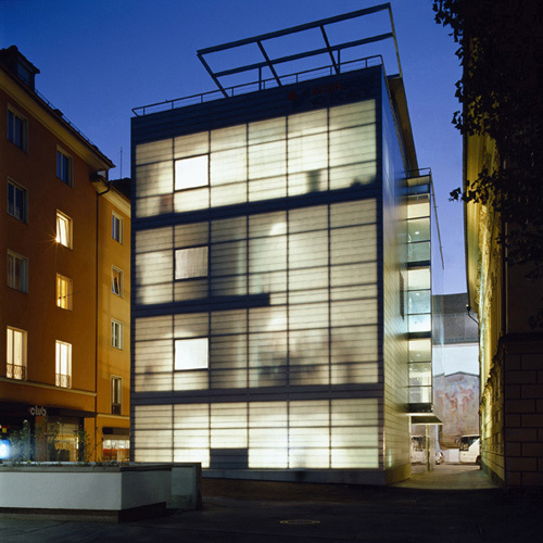 Das wichtigste Argument gegenüber den Skeptikern war die Transluzenz des Gebäudes; sie nimmt dem Gebäude die Schwere und gibt ihm jene Besonderheit, die eine Andersartigkeit für die meisten erst rechtfertigt. Die Materialität der Fassade ist ausschlaggebend für die fast unumstrittene Selbstverständlichkeit, die das Bauwerk trotz aller Widerstände inzwischen schon erreicht hat; derzeit wird sicher kein Gebäude so oft von Passanten mit den Händen betastet wie das Sporthaus Okay. (Text: Wolfgang Pöschl)