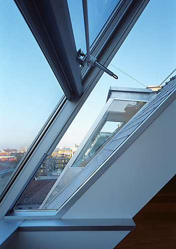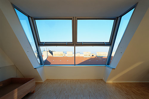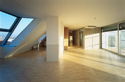 Durch fünf großzügig dimensionierte Gaupen, eine Glas-Aluminium-Konstruktion, die aus dem Winkel der Dachsattel herauskippt, konnte wertvoller zusätzlicher Wohnraum gewonnen werden, was beim Einsatz herkömmlicher Dachflächenfenster nicht möglich gewesen wäre. Tief gezogene Parapete aus Sichtbeton und seitliche Verglasungen optimieren den Tageslichteinfall, zusätzlich ermöglichen kleine geschützte Terrassen den Austritt ins Freie. Im inneren Winkel des L-förmigen Grundrisses sitzt der neue Erschließungsschacht mit Treppe und Lift. Die Zimmerfolge, die Offenheit und Großzügigkeit des Ganges, die therapeutisch notwendige Übersichtlichkeit und die feinfühlige Robustheit der Einrichtung zeigen den humanen Anspruch der Planung von der Gesamtkonzeption bis ins kleinste Möbel-Detail. Dies in der Hoffnung, den Alltag von schwer behinderten Kindern und deren Betreuern durch eine zweckmäßige wie lebensbejahende Architektur positiv mitgestalten zu können. (Text: Gabriele Kaiser)
