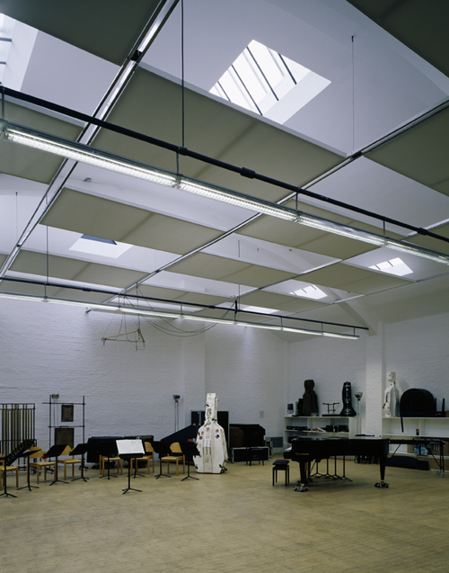 lichtblau.wagner haben mit der Halle aus verschiedenen Gründen eine schwierige Situation vorgefunden. Das tonnenförmige Gewölbe mit Oberlichten besitzt zwar eine hohe ästhetische Qualität und gute Lichtverhältnisse, erwies sich jedoch im Sinne der Raumakustik als mittleres Desaster. Gute akustische Ergebnisse haben vor allem mit Oberflächen und Strukturen zu tun, d.h. ein Gewölbe muss in jedem Falle „gebrochen“ werden. Deshalb wurde die Hallenkonstruktion unsichtbar verändert. Die Bogenträger wurden seitlich verstärkt, die Oberlichten mit neuen Schallschutzfenstern versehen.