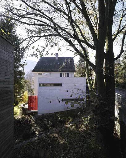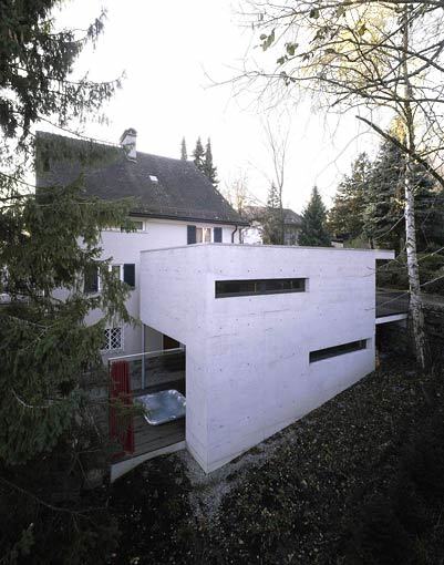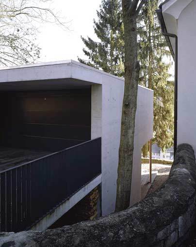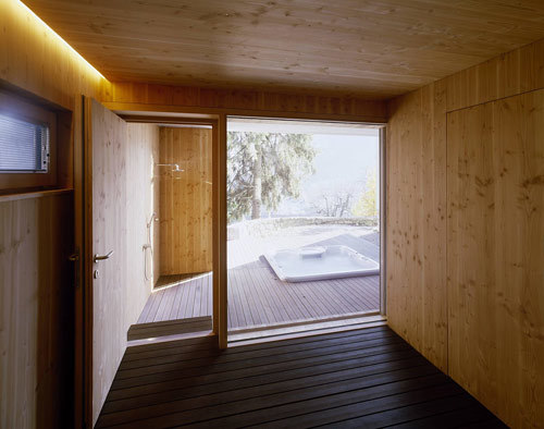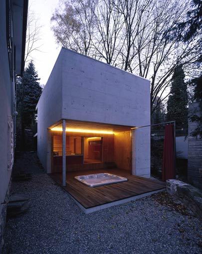 Die Zweigeschossigkeit des Zubaus (massive Sichtbetonschale, Innenausbau in Holz) ergab sich aus der extremen Hanglage, sodass die untere Ebene den Bewohnern nun als uneingesehener Entspannungsbereich (mit allen dazugehörenden Elementen wie Sauna, Liegeraum, Innendusche, Freidusche und Whirlpool) zur Verfügung steht, der zudem eine großzügige Aussicht auf Feldkirch-Stadt bietet. Der Whirlpool im Freien liegt zur einen Hälfte noch im Schutz der Garagenauskragung, zur anderen ist auch ein Sonnen- oder Regenbad im Wellnessprogramm inkludiert. Über einen schon vorhandenen Zugang gelangt man von diesem Bereich direkt ins Haus. (Text: Gabriele Kaiser)