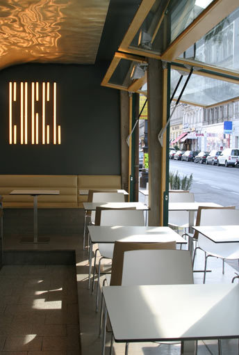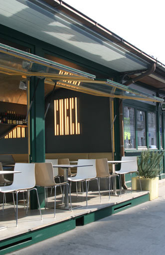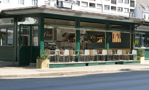 Der Engel beweist das Gegenteil: Die Gäste sitzen erhöht auf einem Podest, blicken dem Koch buchstäblich in die Töpfe. Dazu der Architekt: “Unter dem Motto „dem Koch über die Schultern schauen“ haben wir die extremst denkbare Show-Küche vorgeschlagen, die gleichzeitig den riesigen Vorteil bietet, dass sich Koch und Gäste den Bewegungsraum teilen und somit für den eigentlichen Zweck des Lokals - nämlich Kochen und Essen - am meisten Platz übrig bleibt.” Die zweite wirkungsvolle Maßnahme besteht darin, dass das Fensterparapet der Längswand bei Schönwetter als Podest auf die Straße geklappt werden kann und so den Restaurantbereich verdoppelt. Die Fensterflügel lassen sich ebenfalls nach außen drehen und bieten als Vordach zusätzlich Schutz. Dieser Klapp- und Drehmechanismus beruht auf einer genauen typologischen Analyse der umgebenden Marktstände: „Sind sie geschlossen, weiß man oft nicht, was sie zu bieten haben. Sind sie aber geöffnet, entfaltet sich der gesamte Innenraum mit seinem Angebot nahezu uferlos bis auf die Straße - der fließende Kontakt zum Passanten ist hergestellt, die Verwandlung von diesem zum Gast nur mehr ein Augenblick entfernt.“ Die symbolische Schwelle des Podests gibt dem im Freien sitzenden Gast dennoch das Gefühl, im Lokal zu sein und nicht irgendwo diffus rundum.