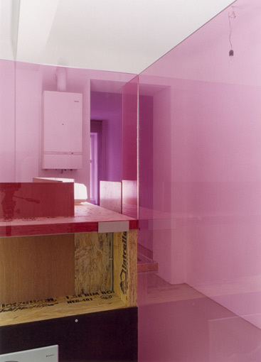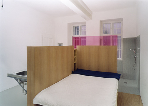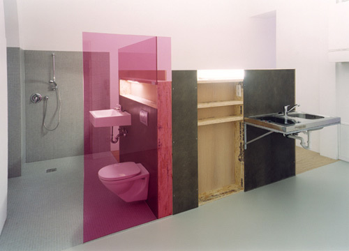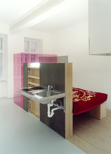 Die elementaren Funktionen von Waschen/Duschen/WC, Kochen und Schlafen sind zu einem „Element“ verdichtet, das wie eine solitäre Plastik frei im Raum steht und bei dem auf „individuelle Raumabschlüsse“ zur Gänze verzichtet wurde. Ein regalähnliches, L-förmiges Traggerüst aus Holzwerkstoff (Intralam) fungiert als Basis eines funktionalen Setzkastens, in dem das gesamte Raumprogramm samt Beleuchtung steckt. Scheiben aus Folienglas beschirmen den Sanitärbereich und verstärken den freistehenden Charakter des zweckintensivierten „Möbels“. Die Innenseite des Winkels sowie ein Wechsel in der Materialität des Bodens definieren den Schlafbereich, schaffen eine gemütliche Nische des relativen Rückzugs. Relativ insofern, als ja ohnehin keine Tür vorhanden ist, die man hinter sich zuziehen könnte. Wozu auch: die Einraumwohnung ist ideale Behausung für eine Person. Mehrere würden sich auch in dieser optimierten räumlichen Fassung früher oder später auf die Zehen steigen. (Text: Gabriele Kaiser)