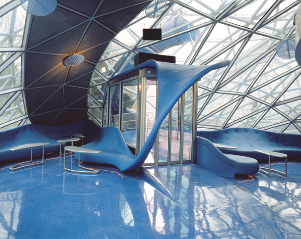 Kulturelle Schnittstelle made by Acconci Studio & purpur.cc„Wir wollten etwas entwerfen, das sich markant in zwei Zonen teilt, und diese sollten flüssig ineinander laufen“, erklärt Acconci, „der Dome verdreht sich wie in einer Schraubenbewegung zur „Bowl“, während die Bowl auf der anderen Seite, ebenso um die eigene Achse gedreht, ihrerseits wieder zum Dome wird. Dieser fungiert als Café, die Bowl als Amphitheater, und das Gelenk in der Mitte – der Übergang von Dome zu Bowl und umgekehrt – wird als Spielplatz genutzt. Wenn Leute im Theater sitzen, sehen sie den Spielplatz als Hintergrundelement, wenn sie sich im Cafe´ befinden, schützt sie der Playground als Teil des Daches des Cafés. Diese verschiedenen Funktionen dürfen nicht radikal voneinander getrennt sein, denn das Wasser rund um diese Insel fließt und bewegt sich ständig, und wir wollten etwas konstruieren, das ebenfalls flüssig und veränderlich ist.“
