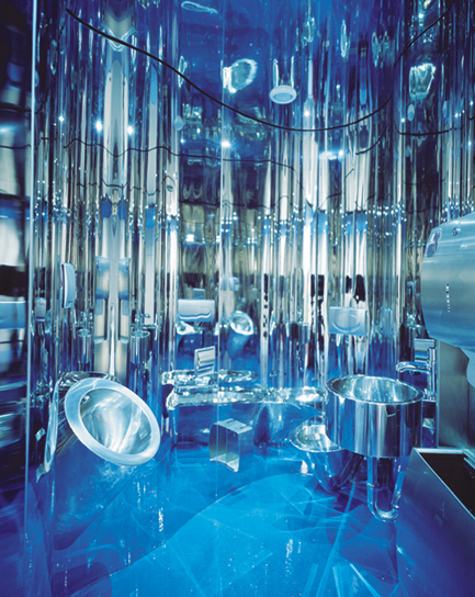 In einer Schraubenbewegung verdreht sich der Eingang in die Bank, die Bank zur Bar, unendlich, beinahe flüssig, aufgelöst, wie in den gekrümmten Spiegeln der Toilette. Playground für Flaneure, in einer quasi – Verzögerung einer „Schale“ Kaffee.