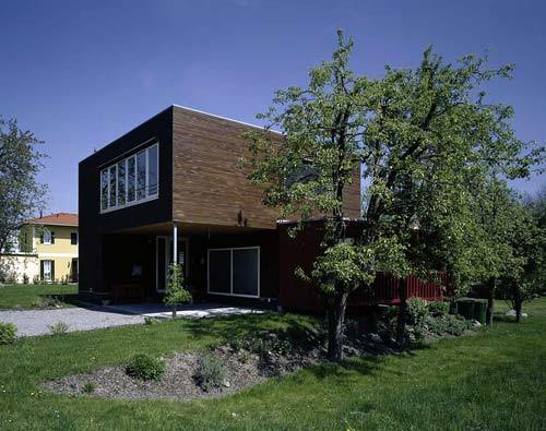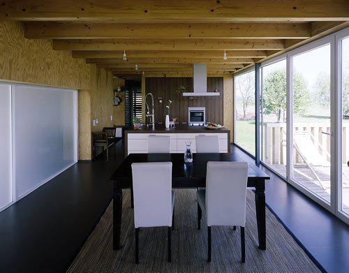 Das teilunterkellerte Haus wurde vorwiegend mit Seekiefersperrholzplatten beplankt, die fast sämtlichen Oberflächen eine angenehm warme Ausstrahlung geben, die Decken bestehen aus einer Balkenlage, die Außenwände im Erdgeschoss und im Obergeschoss aus Holzrahmenelementen. (Text: Architekt)