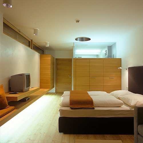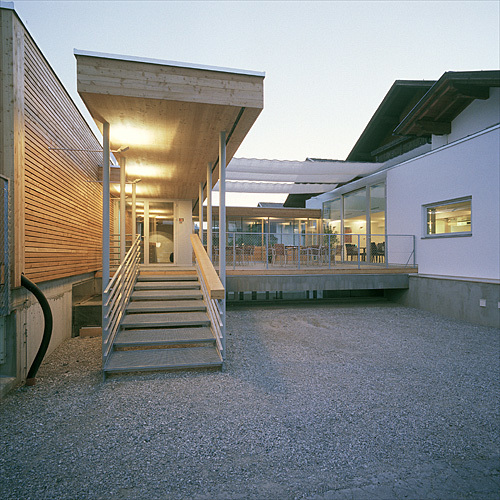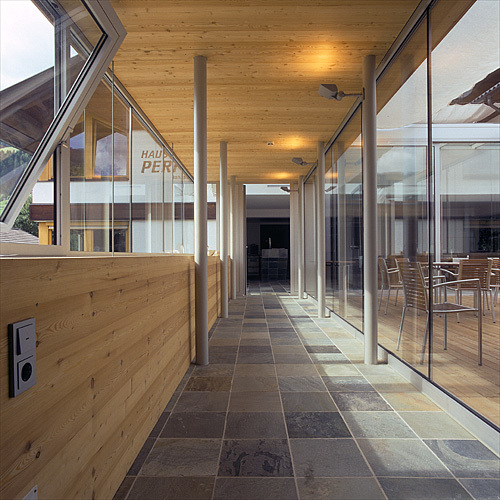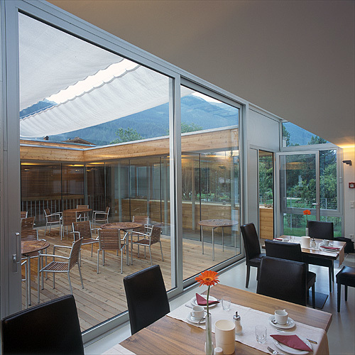 Eine Überraschung – auch im Pustertal zeigt sich ein Silberstreif am Horizont touristischer Architektur. Die kleine Pension als erweitertes Haus einer Familie bot in den Alpentälern immer schon eine günstige und individuelle Alternative zu den großen Hotelzentren – zumeist allerdings mit eher anspruchsloser Haltung zu Architektur und Möblierung. Das transformierte und erweiterte Haus in Sillian zeigt nun vorbildlich, wie ein solches, in Tirol durchaus weit verbreitetes Thema zukunftsfähig interpretiert werden kann.Ein stereotyper Altbau, in dem die Bauherren nach wie vor wohnen, wurde mit gut gesetzten Eingriffen modernisiert und das Erdgeschoß als Speisesaal und Kamin-Lobby großzügig geöffnet. Nach Süden wurde der Bestand um eine Terrasse ergänzt, die zum westlichen Nachbarhaus mit einem Verbindungsgang sowie zur Straße mit dem flachen Zubau für acht Hotelzimmer abgeschirmt ist. Damit entstand eine gleichsam mediterane Raumsequenz zwischen Innen und Außen rund um einen intimen Atriumhof. Unter dem leicht übers Terrain gehobenen Zimmertrakt ist ein gut belichtetes Parkdeck eingeschoben und unter dem Atrium ein Sauna- und Wellnessbereich „eingegraben“, der von zwei Seiten natürlich belichtet ist und sich an der Westseite auf einen vom Nachbargrund abgeböschten Freibereich hin öffnet. Sehr beachtlich auch die einfache, in allen Materialien und Details durchdachte, stimmige Möblierung, speziell in den Doppelzimmern.