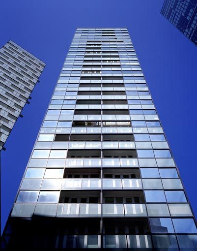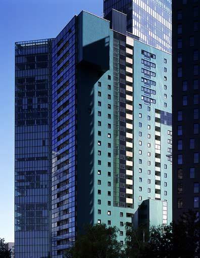 Bleiben wir beim Objekt, lassen wir es als einer der „Einzelheiten“ an der Seite des Twin Towers stehen: Den Beinamen Monte Verde (nicht zu verwechseln mit Monte Laa) hat der 77 Meter hohe Wohnturm einer grünen keramischen Plattenfassade zu verdanken, die das Gebäude an der West- und Ostseite bedeckt, während an den Schmalseiten eine zweischalige Glasfassade mit mehrgeschossigen auskragenden Erkern den Bewohnern den begehrten („großartigen“, „grandiosen“, „atemberaubenden“ etc.) Ausblick sichert. Auch liegt dem Hochhaus eine ökologische Konzeption zugrunde (innere Durchwebung des Gebäudes mit zum Teil geschossübergreifenden Gemeinschaftseinrichtungen sowie „innere Grünräume“), die zu diesem Hausnamen geführt haben.
