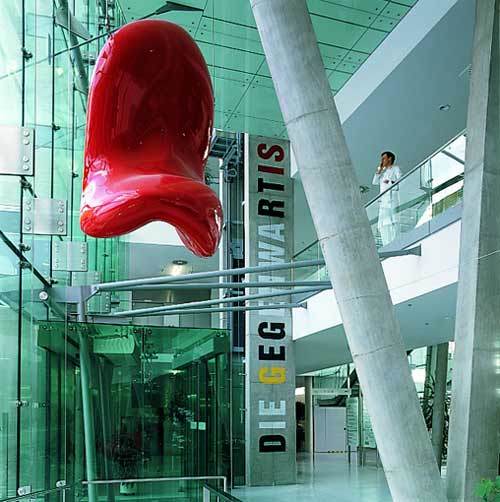 Man muß sich die funktionelle Organisation des Gebäudes so vorstellen: Es gibt die große, zentrale Erschließungshalle, links davon geht es zu den Ambulanzen. Und in den oberen Geschoßen sind im wesentlichen die verschiedenen Krankenstationen. Die Kreuzform der Gebäudekonfiguration wird an der Rückseite durch einen zweigeschoßigen Flügel hergestellt, der ausschließlich Ein- und Zweibettzimmer für Klassepatienten enthält, an der Vorderseite, auch als raumbildende Fassung des Vorplatzes, durch zwei niedrigere kubische Bauten, denen leuchtend gelbe, nahezu organisch geformte Körper aufgesetzt sind - sie enthalten die umfangreiche Technik, die heute im medizinischen Bereich gebraucht wird.