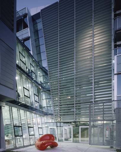 Egal welchen Zugang man wählt: Der Raumeindruck der Empfangs- und Erschließungshalle ist überwältigend. Durch die Glasfassade ist sie lichtdurchflutet, durch die innere Organisation großzügig. Gegenüber vom Haupteingang der Empfangsbereich, dahinter die Verwaltung; rechts vom Empfang eine Bankfiliale und ein Café mit großer Terrasse; links eine kleine Kapelle.