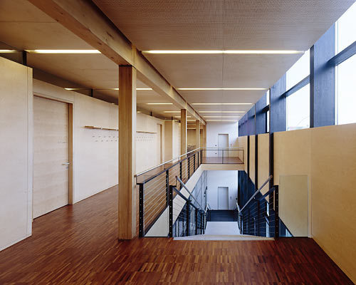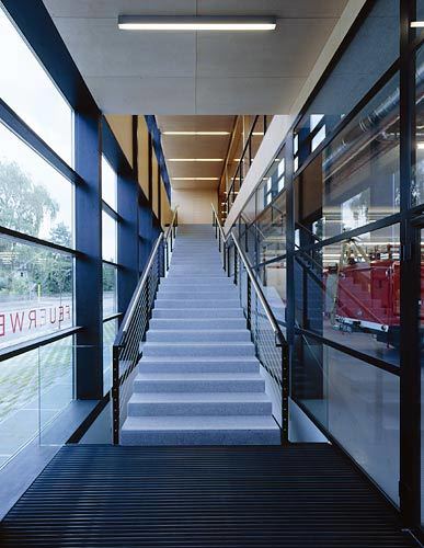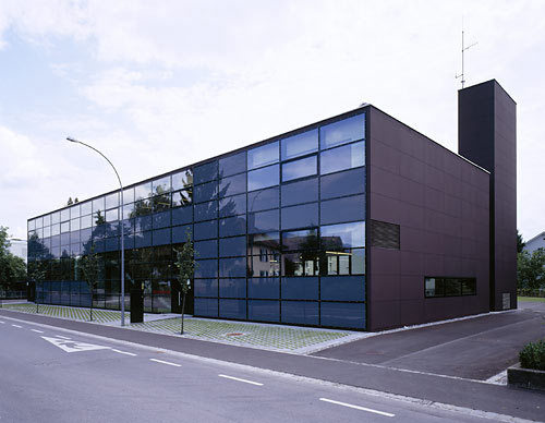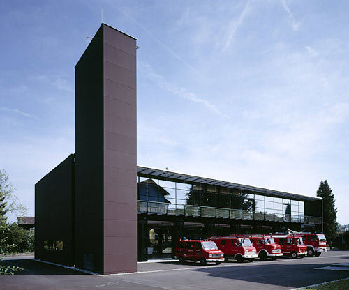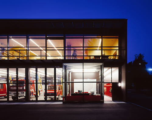 Diese explizite Teilung der Raumzonen-Richtungen nach Norden und Süden lässt sich sowohl in der Konstrution als auch im Innenraumkonzept nachvollziehen. Dazu der Architekt: „Die transparente Gestaltung der Eingangszone zur Fahrzeughalle verbindet diese Raumzonen sowohl horizontal wie vertikal. Weitere Funktionselemente ergänzen die klare Gebäudestruktur; der Vorbau des Nachrichtenraumes, die Vordach- und Sonnenschutzzone südseitig und der freistehende Schlauchtrocken- und Übungsturm.“ Das Feuerwehrgebäude konnte dank Erdkollektor, einer kontrollierten Be- und Entlüftung sowie der Passivnutzung durch die Südfassade energetisch optimiert werden (ca. 30 KW h/m2/a), ohne auf Seiten der architektonischen Gestaltung „nachzulassen“. Das Ergenis: hohe architektonische und technische Qualität, die auf dem Engangment aller beiteiligten Fachplaner beruht. (Text: Gabriele Kaiser)