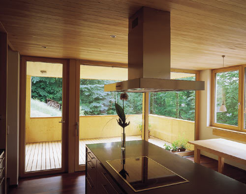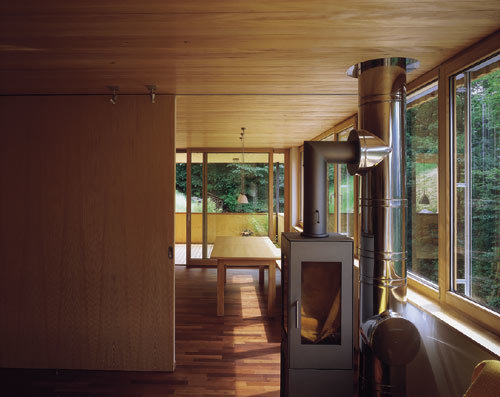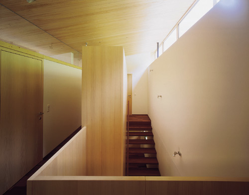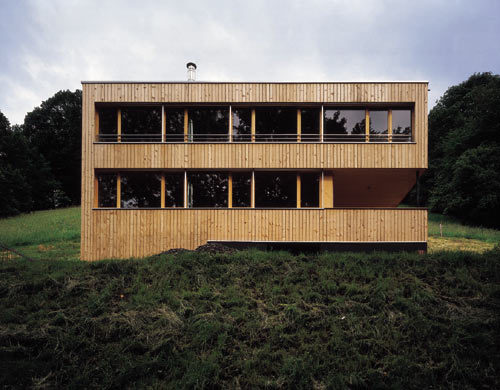 Die Fassade des Gebäudes besteht aus einer Lattung aus Weißtanne. Durch den fortschreitenden Alterungsprozess und die Farbangleichung des Holzes wird in absehbarer Zeit eine deutliche Beziehung von Gebautem und Landschaft entstehen. Auch im Inneren wurden vorwiegend Holzoberflächen verwendet. So wurde bei den Decken im Erd- und Obergeschoss die Untersicht der tragenden Brettstapeldecken sichtbar gelassen, im Dachgeschoss gibt es eine Untersicht in Weißtanne. Für die Fußböden wurde überwiegend Akazie eingesetzt. (Text: Architekt)