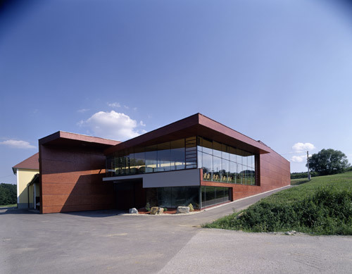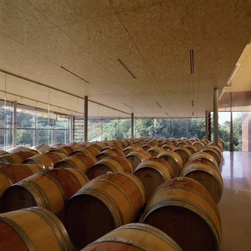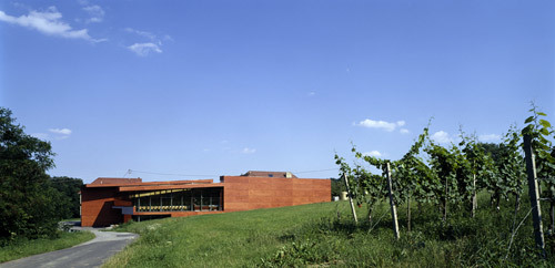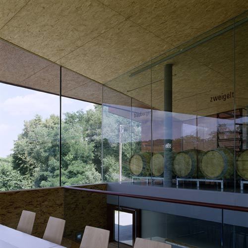 Diese Homogenität entspricht der kontinuierlichen Faltung der Gebäudehülle, die einerseits die vorhandene Hangneigung des Geländes und andererseits die unterschiedlichen funktionalen Anforderungen an die Lage der Gebäudeniveaus, die Raumhöhen und die Lichtführung reflektiert. Die Schräge der Decke bewirkt im Inneren des Obergeschoßes des Gebäudes eine perspektivische Dynamisierung von der Anlieferung der Trauben hin zur Reifung in den Barriquefässern, die hier bewusst weithin einsehbar aufgestellt sind. Die Edelstahl-Gärtanks stehen in einem zweigeschossigen Gebäudeschlitz und sind von beiden Betriebsebenen aus zu bedienen. Während die Produktionsbereiche nur von indirektem Licht aus Oberlichtbändern belichtet sind, ist der Verkostraum rundum verglast: Hier ist die Herkunft des genossenen Produkts durch den Ausblick auf den Weinberg, den Durchblick entlang der Edelstahltanks und den Einblick in das Barriquelager unmittelbar präsent. Zur Auslieferung gelangt der Wein über das Untergeschoß oder den Verkaufsraum, welcher sich unter dem Verkostraum befindet. (Text: Architekten)