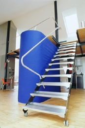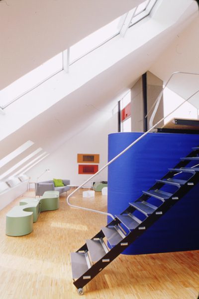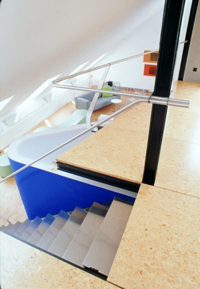 An einer Stelle des Daches wurde ein Teil der Dachhaut weggelassen und ein Einschnitt für die Terrasse geöffnet. Ein Podest wurde als horizontale Ebene eingezogen. Der Eingangsbereich, die Küche und das Bad sind mit blauem Markisenstoff umhüllt und bilden markante Fixpunkte im Raum. Eine Besonderheit stellt auch der „Treppen-Bausatz“ dar. Dieser ist zusammengeklipst, kommt ohne Schrauben aus und ist einfach am Autodach transportierbar.