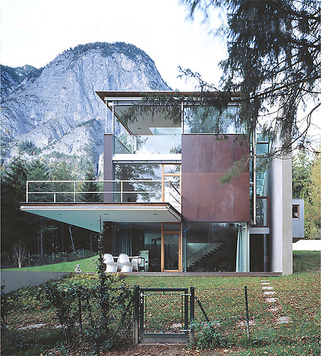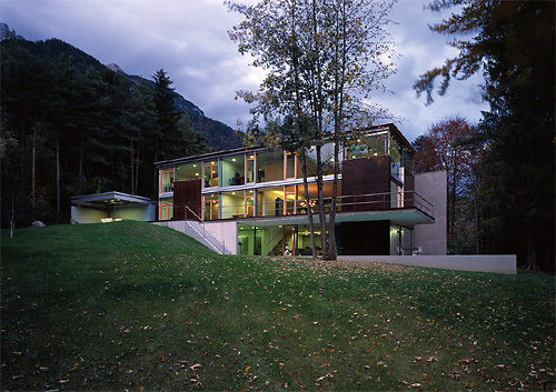 Schroff und mächtig ragen die Felsen der Kranebitter Klamm in den Himmel über Tirol. Unweit von Innsbruck liegt diese Schlucht im Mischwald der unteren Nordkette, deren Naturgewalt die Bauherrn sofort faszinierte. Hier kauften sie 2000 m² Freiland mit partieller Bauwidmung. Versteckt hinter einer scharfen Straßenkehre, liegt seine Ostgrenze in der Verlängerungsachse der Schlucht. Laut tost der Bach durch dichte, gebirgig ansteigende Föhren, vor denen sich der Grund imWesten zur Wiesenlichtung weitet, nach Süden abfällt und dann wieder in Wald übergeht.
