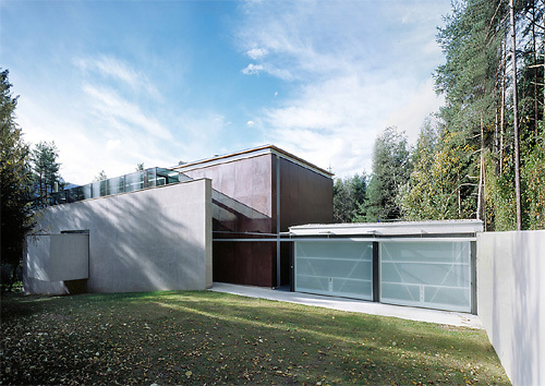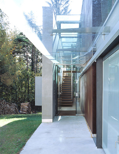 Vieler Worte bedurfte es beim Planen und Bauen nicht mehr. Das Paar vertraute der schöpferischen Intuition des Architekten blind und bekam, was es wollte: ein Haus, so archaisch wie die Landschaft. Mit rostigen Blechpanelen verkleidet, liegt es an einer rauen Sichtbetonklamm mit oberlichtgefluteter Treppe, wo die drei Wohnebenen andocken. Mit verglaster West- und Südfront öffnen sie sich zur Landschaft, um von der schwebenden Terrasse mit einer steilen Außentreppe im 15 m langen Schwimmkanal vorm gläsernen Spielkeller in sie einzutauchen. Wie ein Glühwürmchen schimmert nachts Licht durchs satinierte Garagenglastor an der Zufahrt im Nordosten, die sich gartenseitig zur Pergola ausweitet. Sie bildet den Auftakt zur imposanten Hausskulptur für zwei Generationen. Eine hohe, scharfkantige Sichtbetonscheibe flankiert die Ostlängsfront, rätselhaft ragt eine schwebende Betonbox aus der Wand, über die sich ein gletschereisiger Glasquader schiebt, dahinter ragen die rostigen Blechpanele des Hausbaukörpers hoch.