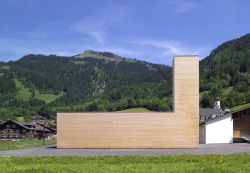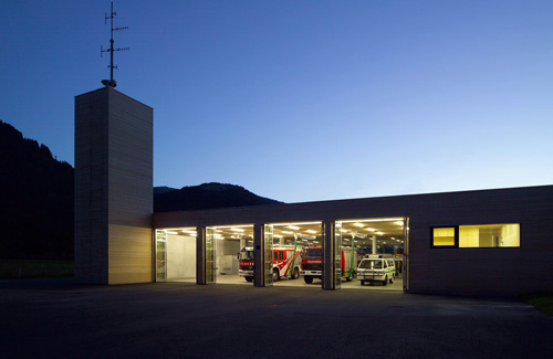 Das Gebäude sollte als reiner Holzbau errichtet werden. Aufgrund brandschutztechnischer Vorschriften und funktioneller Anforderungen ergaben sich jedoch Reibungspunkte, die eine reine Holzkonstruktion nur unter großen formalen und materiellen Einbußen ermöglicht hätten. Im Sinne einer ganzheitlichen und konsequenten Planung wurde deshalb der Garagenbereich des Hauses als „Betonbox“ in das Gebäude geschoben. Der sägerauhe Rhombusschirm aus ortseigenem Fichtenholz bekleidet das ganze Gebäude. Der Mannschaftsbereich der Feuerwehr und Bergrettung wurde – analog zum gegenüber gelegenen Kultur- und Geschäftshaus – komplett in Holz errichtet und ausgebaut.