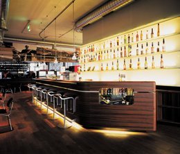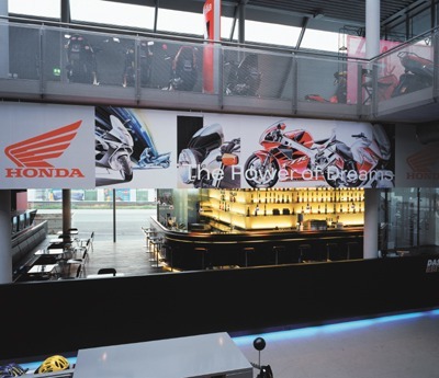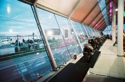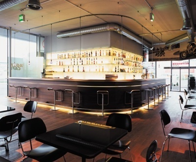 The design spotlights the product within: the ideas of speed and motion are captured by the streamlined shape of the reinforced concrete, glass and steel skeleton construction. The interior décor is neutral and unobtrusive. Only an expansive bar in the entry level, with dark wood paneling and an elegantly curved counter, vies for attention with the bicycles and motorcycles on display.