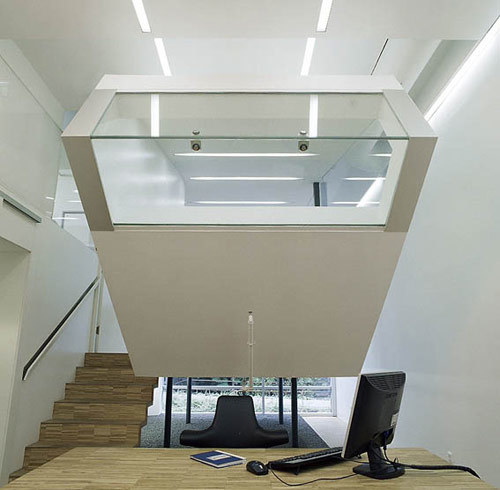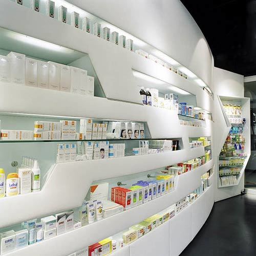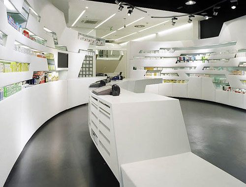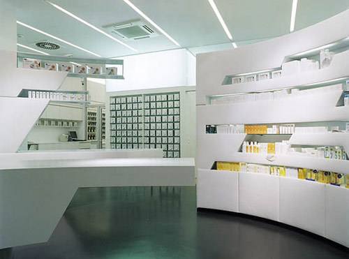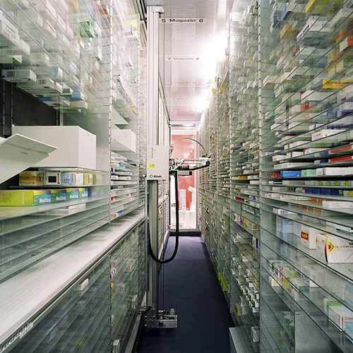Doch die Logistik des Apothekenbetriebes waltet auch dort, wo es von außen nicht mehr einsehbar ist. Jeder Quadratzentimeter und jede Minute des Arbeitsprozesses ist minutiös genutzt, von der Anlieferung bis hin zur automatischen Sortieranlage ist nichts zum Zufall überlassen. Mehr noch wurden bereits alle Maßnahmen getroffen, um den Nachtdienst eines Tages durch das so genannte und unbemannte Vis-à-Via-System zu ersetzen. Der nächtliche Kunde wird dann über Bild und Ton mit dem diensthabenden Apotheker kommunizieren, dieser kann per Befehl – auch von zu Hause aus – dem Lager das ersehnte Medikament entlocken, in wenigen Sekunden öffnet sich in der Fassade ein kleines Ausgabefenster und das Aspirinschachterl rutscht in die Nacht hinaus. (Text: Architekten)