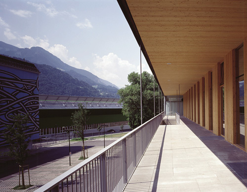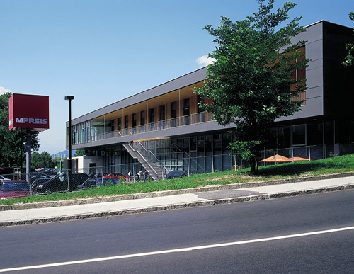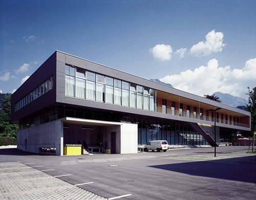 Alle Entsorgungsleitungen sind in die Säulen im 7,5 x 22 m Raster eingelegt. Die Außenhaut aus antrazithfarbenem „Eternight“ bildet den farblichen Rahmen für rötliche Lärchen-3s-Platten. Terrasse und Treppe wurden zur Verringerung des Feldmomentes von den Dachträgern abgehängt. Die Wände im Cantina-Geschoß bestehen zur Gänze aus vorgefertigten Holzelementen, ebenso das Dach, dessen primäre Tragkonstruktion aus unterspannten Stahlträgern besteht. Der Baukörper ist an der Kreuzung ins Gelände eingeschnitten - die Straße und der kleine Park wirken wie ein lebendes Bild in den Raum hinein. (Text des Achitekten)