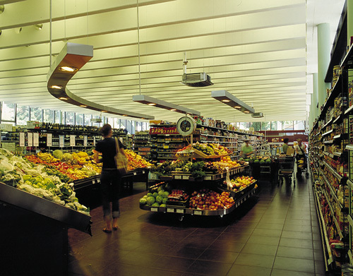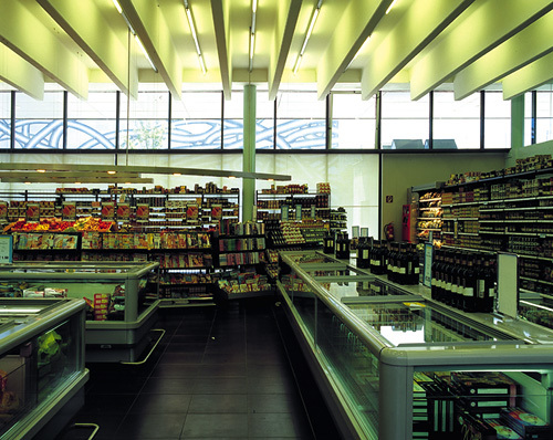 Der Verkaufsraum des Supermarkts wurde trotz der großen Nutzlasten aus dem Obergeschoß 22 Meter stützenfrei überspannt. Vorgespannte TT Deckenelemente sind an den Auflager-Enden so ausgeklinkt, dass ein „schwebender“ Eindruck entsteht, versetzt angeordnete Leuchtbalken verwandeln den oberen Raumabschluss in eine Lichtdecke mit einer Art Moiré-Effekt, der die Leichtigkeit unterstützt.