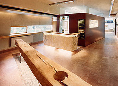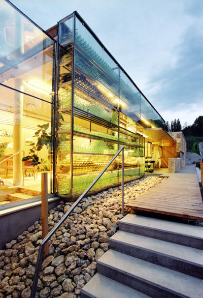 Die Verbindung des als „Keller“ gewidmeten Neubaus mit der Topografie des Weinbergs ist in jeder Hinsicht als symbiotisch zu bezeichnen. Die Ausläufer des Weinhangs gehen nahtlos in ein begrüntes Flachdach über, die roh belassenen Tafeln der Sandsteinfassade verweisen auf die Beschaffenheit des fruchtbaren Bodens, und mit dem gläsernen Wintergarten wachsen und gedeihen die Reben auch im Haus selbst. Die Verglasungen des neuen Traktes werden durch ein davor gestelltes, L-förmiges Flaschenregal zum stimmungsvollen Lichtkörper aufgewertet, der der zwischen Offenheit und Geschlossenheit oszillierenden Fassade eine zusätzliche Raumtiefe gibt. (Text: Gabriele Kaiser)