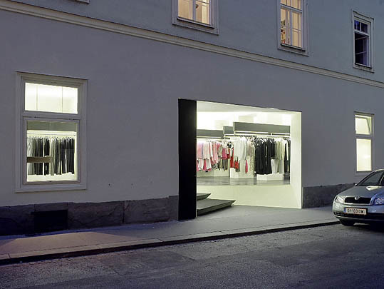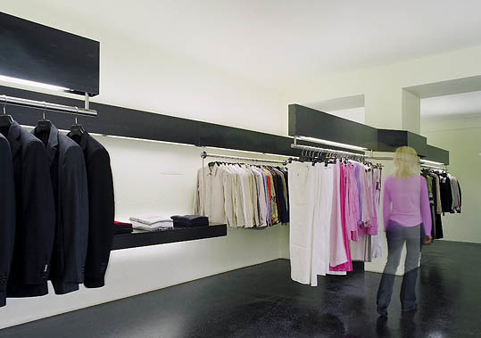 Die Reduktion auf das Wesentliche in Materialität und Formsprache gibt der exquisiten Mode einen architektonischen Rahmen: Kaum merkbar gehen Straßen- und Bodenbelag fließend ineinander über. Die puren, dezent mintgrünen Wände verzichten auf jegliche zusätzliche Einbauten wie Decken- und Wandleuchten. Eine multifunktionale Kleiderstange zieht sich wie ein roter Faden durch die gesamte Länge des Ladens. Trotz Ihrer zurückhaltenden Erscheinung ist sie das herausragende gestalterische Element im Innenraum. Über die eigentliche Funktion des Präsentierens der Kleider hinaus, vereint dieses scheinbar frei schwebende Objekt geschickt verschiedenste Funktionen. Als Wegeleitsystem für Kunden, sorgt es gleichzeitig dank integrierter Leuchtmittel für ein indirektes Raumlicht und eine direkte Beleuchtung der exklusiven Ware.