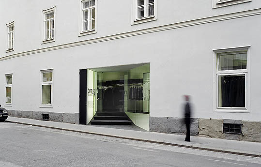 Mitten in der Grazer Altstadt befindet sich im denkmalgeschütztem Gebäude Bürgergasse 11 das OUTLET des exquisiten Modeausstatters Wolfensson. Was zuvor an dieser Stelle schon mehrere Geschäftsideen scheitern ließ - die hohen Auflagen des Denkmalschutzes - wurde hier zum Konzept der neuen Architektur. Ende des 18. Jhdts. wurde das zu einem Dominikanerinnen-Klosterkomplex gehörende Eckhaus zum letzten Mal entscheidend umgebaut. Seither blieb es im Wesentlichen unverändert.Selbstbewusst reagiert nun die neue Architektur auf die Vorgaben des Denkmalschutzes: Unantastbarkeit der Lochfassade, keine auskragenden oder additiven Elemente wie Vordächer, Treppenstufen, Steckschilder u. ä. Statt sich resigniert unterzuordnen, bewegen sich die architektonischen Eingriffe elegant innerhalb dieser Beschränkungen. Der Entwurf entwickelt gerade daraus eine eigene Dynamik und Leichtigkeit - das Verbot als Inspirationsquelle.