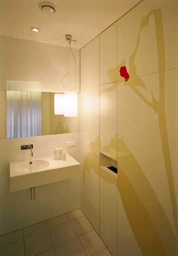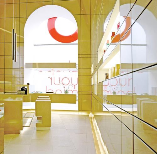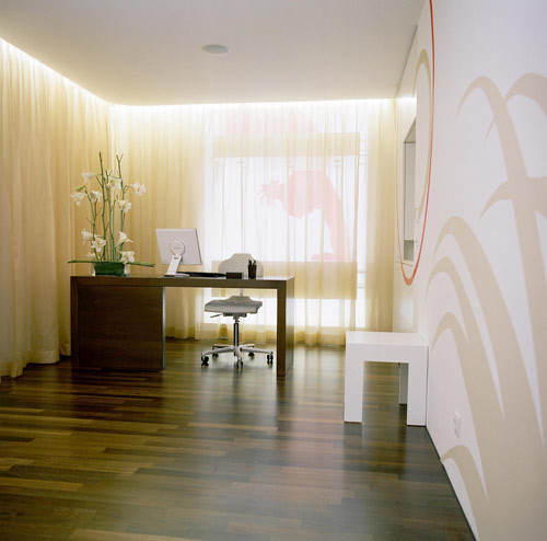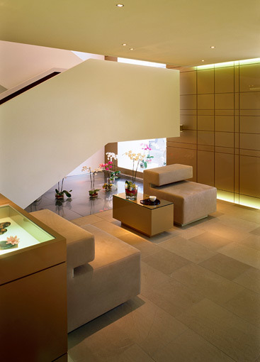 Die Körperlichkeit und auch die Energie des Raumes entstehen durch Gegensätze wie die von rauem Naturstein und hochglänzenden goldenen Wänden, von dunkel geöltem natur belassenen Holz und präziser Keramik, von leuchtenden textilen Flächen und klaren weißen Räumen mit medizinischer Technik. Die Schnittstelle nach außen bildet der zweigeschossige Eingangsbereich in dem Shop, Lounge und Empfang fließend ineinander übergehen. Der Raum wird rundum durch hochglänzende goldene Wandflächen eingefasst. Über leuchtende Schlitze an Boden und Decke scheinen sich die goldenen Wandflächen weit über den Raum hinaus fortzusetzen. Die großen Fensterflächen drücken sich aus der Fassadenflucht und lassen den goldenen Raum weithin wahrnehmen. Im Treppenbereich schafft ein Wasserbecken angenehm bewegte Lichtreflexe, die sich über den ganzen Raum ziehen. Die Moderation der Atmosphäre erfolgt durch Licht. Licht dringt aus Schlitzen, durch Unterleuchtung schweben die goldenen Möbel gleichsam auf einem Lichtteppich im Raum. Der Schein eines virtuellen Kaminfeuers bringt beruhigende Stimmung in die Lounge. Die Verbindung von sachlicher und technischer Kompetenz mit natürlichen Materialien erzeugt für den medizinischen Bereich eine sympathische Atmosphäre bei der das Wohlbefinden im Mittelpunkt steht. (Text: Architekten)