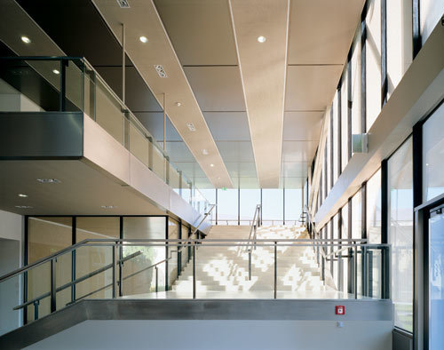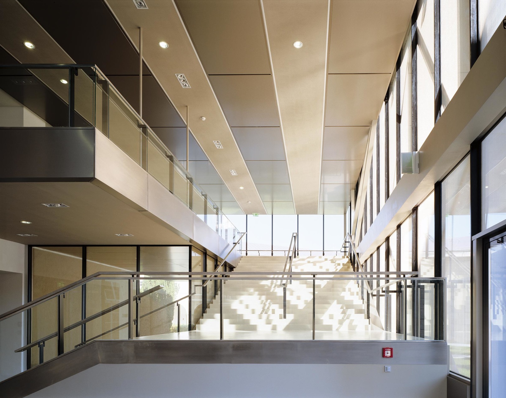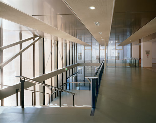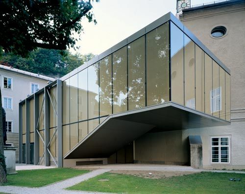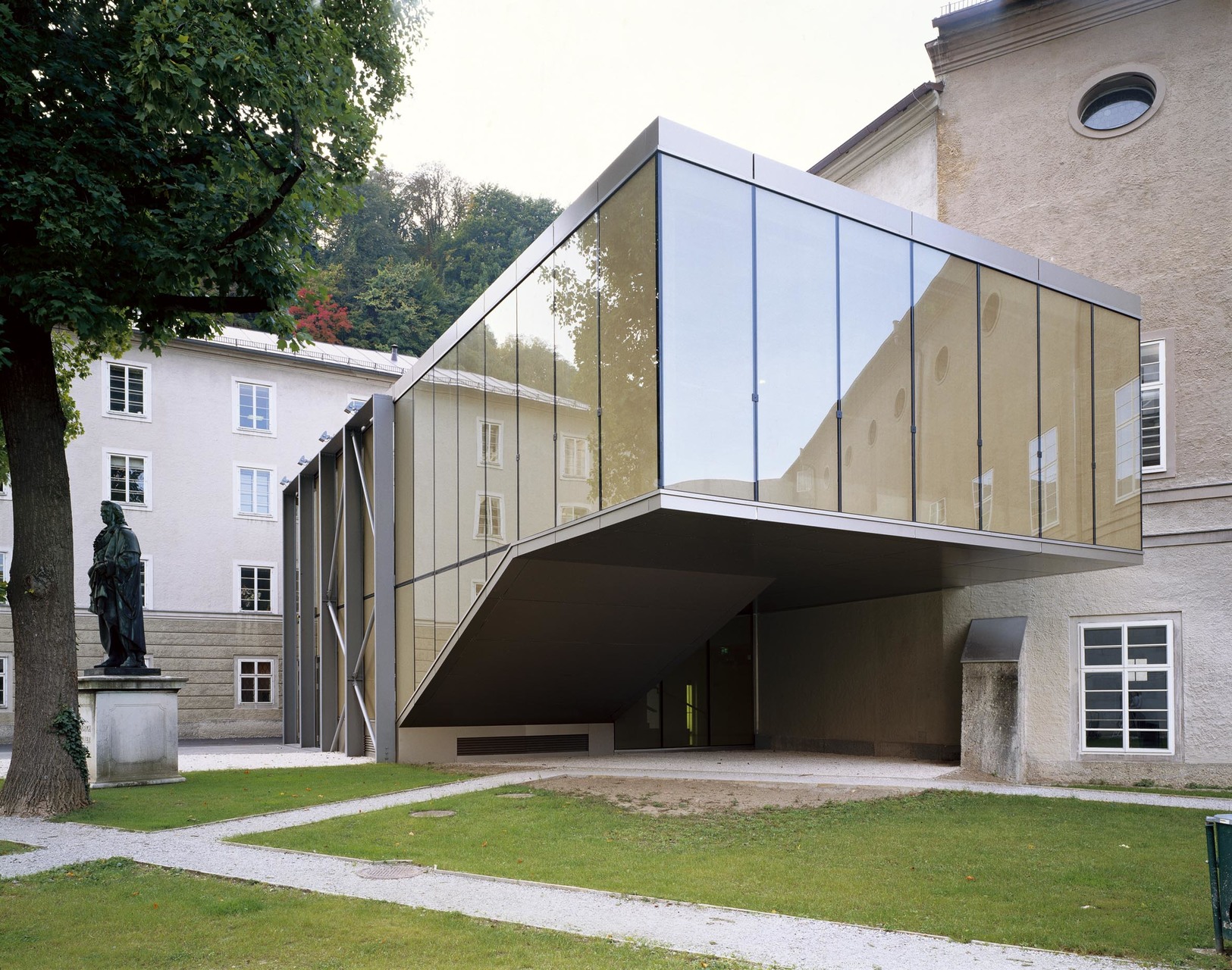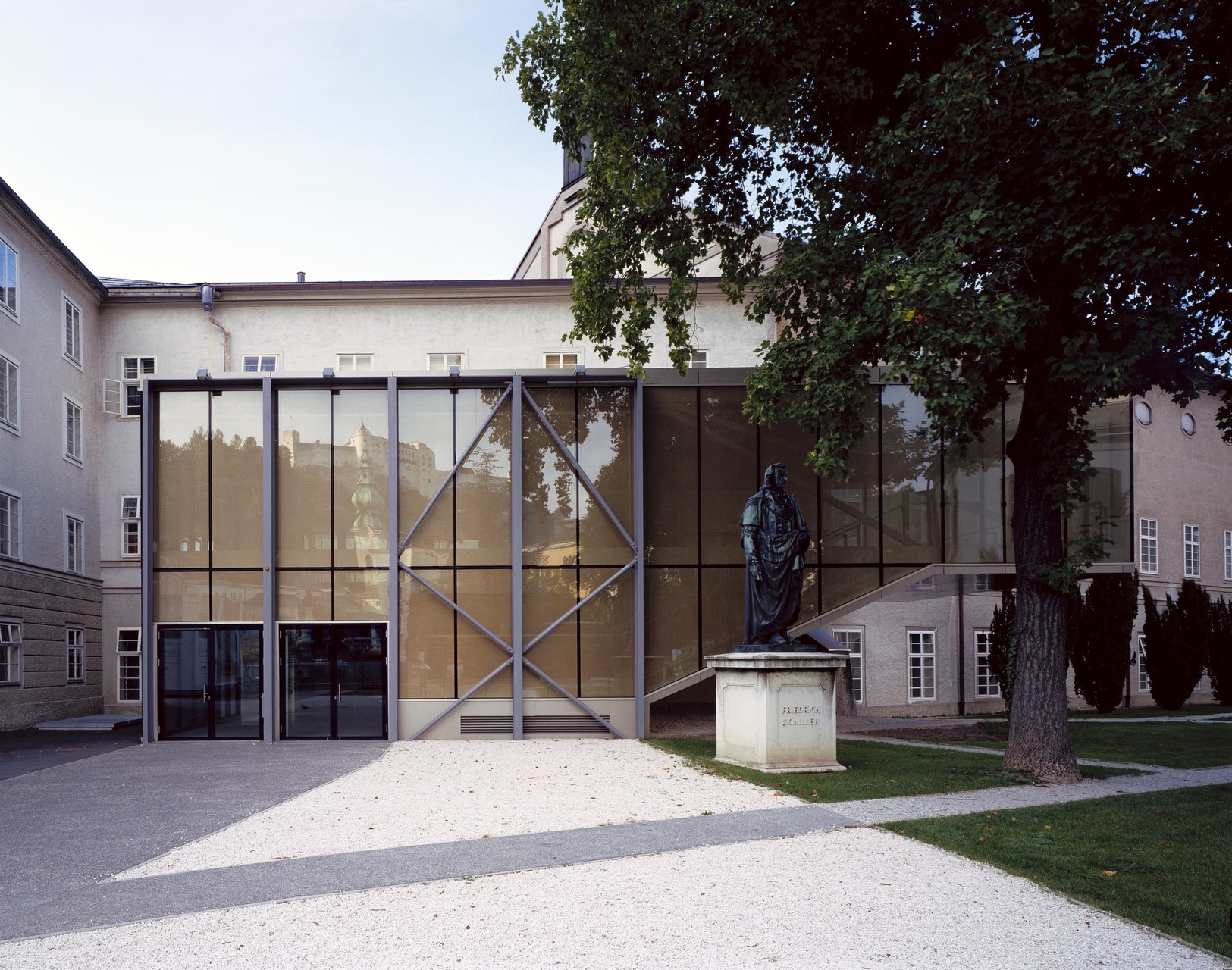 Mit geradezu barocker Wucht ordnet er das Areal zu einer Einheit. Das neue Stiegenhaus ist der erste realisierte Baustein dieses Gesamtkonzepts. Im Spiel von Transparenz und Intransparenz bildet es in seiner Funktion als Erschließungs- und Aufenthaltsbereich sowie in der materiellen Durchbildung einen Filter von Innen und Außen. So wirkt das zwischen den Gläsern eingelegte, golden eloxierte Metallgewebe wie einer Schleier, der sich über den Blick in die Stadtlandschaft legt. Gesteigerte Noblesse und pure Funktion wohnen also in diesem Bauwerk – wie so oft in den Häusern der Salzburger Altstadt – ganz nahe beieinander. (Text: Roman Höllbacher)