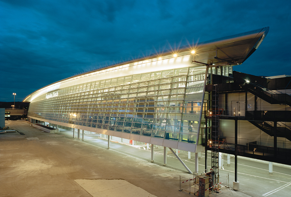 Nachts wirkt die Glasfront wie die Haut eines riesigen Leuchtkörpers. Weithin sichtbar, ist das Airside Center das neue Gesicht des Flughafens, der dadurch an internationaler Bedeutung gewinnt. Zwölf Monate Vorlauf- und zehn Monate Montagezeit waren nötig, um dieses Bravourstück der Ingenieurskunst in Stahl zu vollenden.