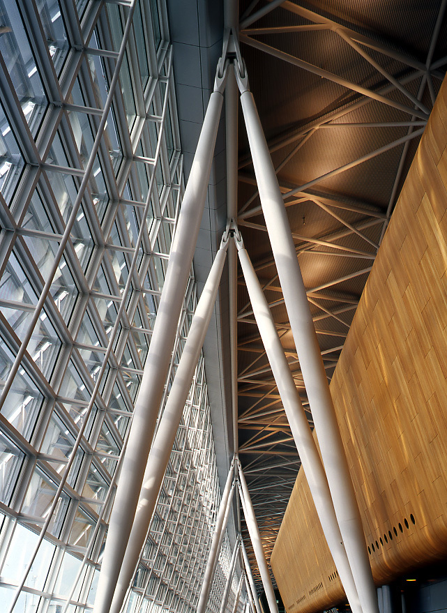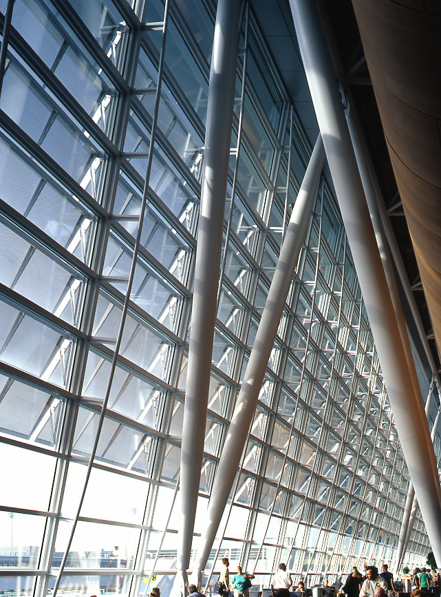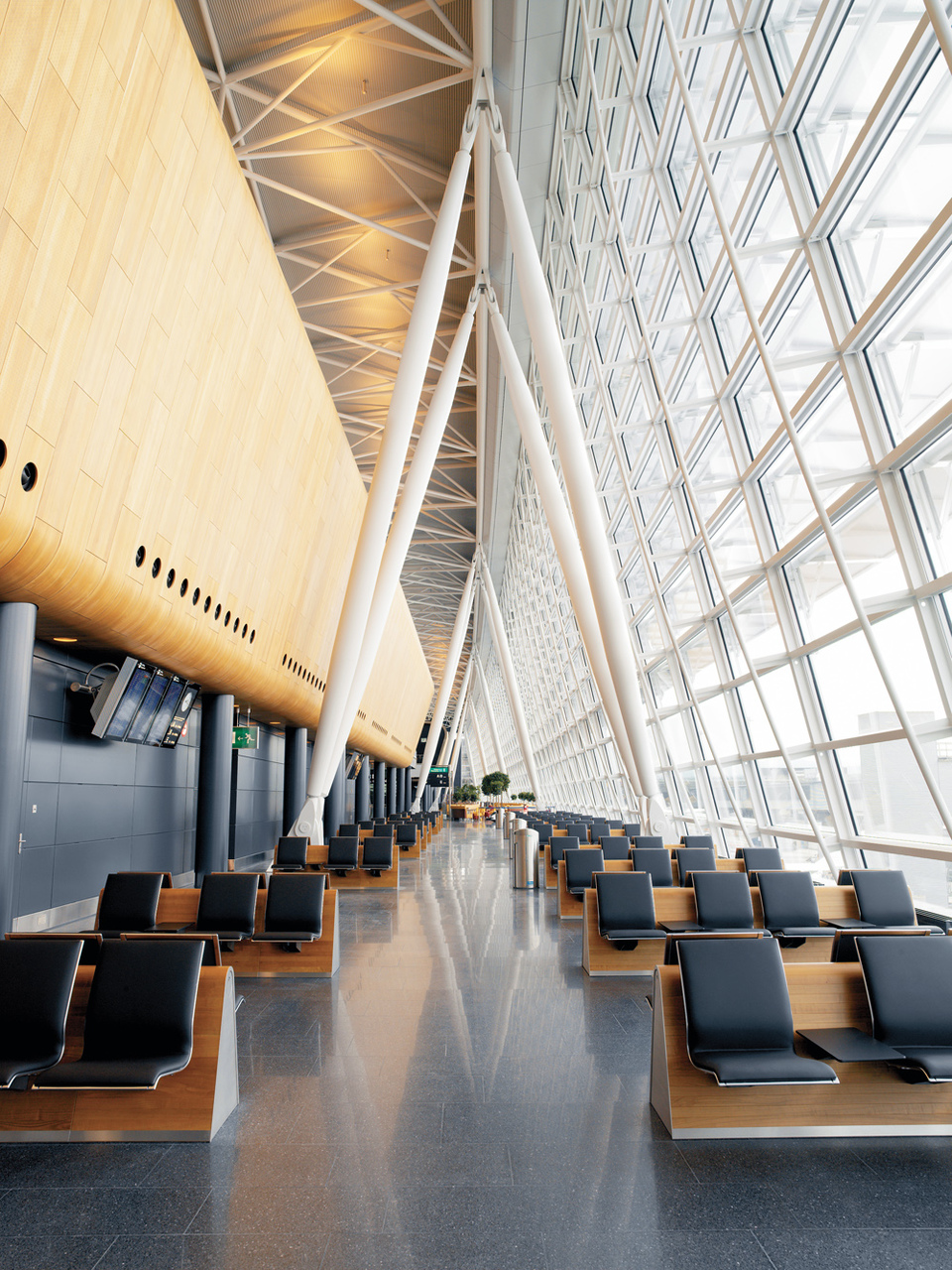Kaum ein Flughafen bietet seinen Gästen eine grossartigere Willkommens- und Abschiedsgeste. Das Airside Center ist von einer gelassenen Heiterkeit erfüllt, die sich auf den Besucher überträgt. Eine gedämpfte Geräuschkulisse tut sich auf, fast meint man, flüstern zu müssen. Keine Hektik, kein Gedränge – man flaniert an edlen Boutiquen vorbei und betritt eine lichte Wartehalle mit gotischen Dimensionen. Der Blick geht nach oben, folgt dem grossen Schwung der Linien, misst die Höhe und die Tragkraft der Stützen. Man wünschte sich, noch etwas Wartezeit zu haben, um sich hier dem offenen Blick in die Landschaft und der Wirkung des Raumes hingeben zu können.