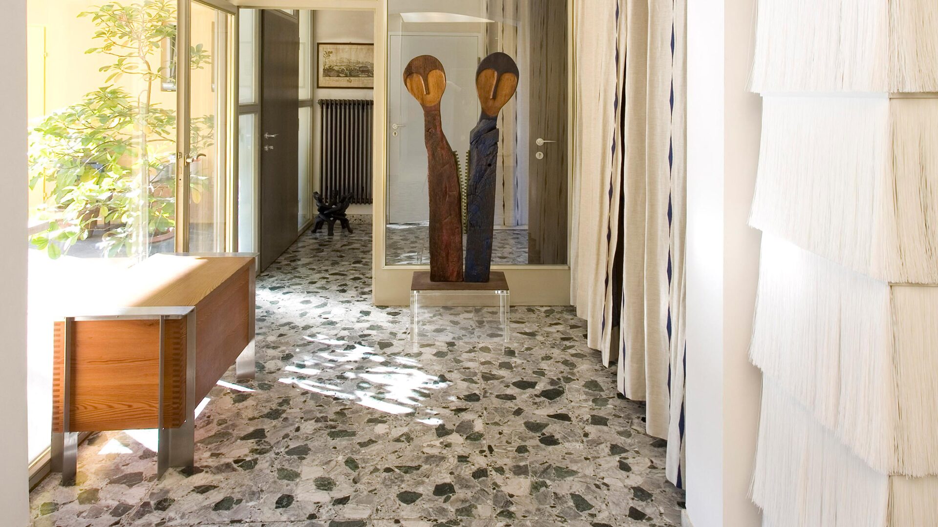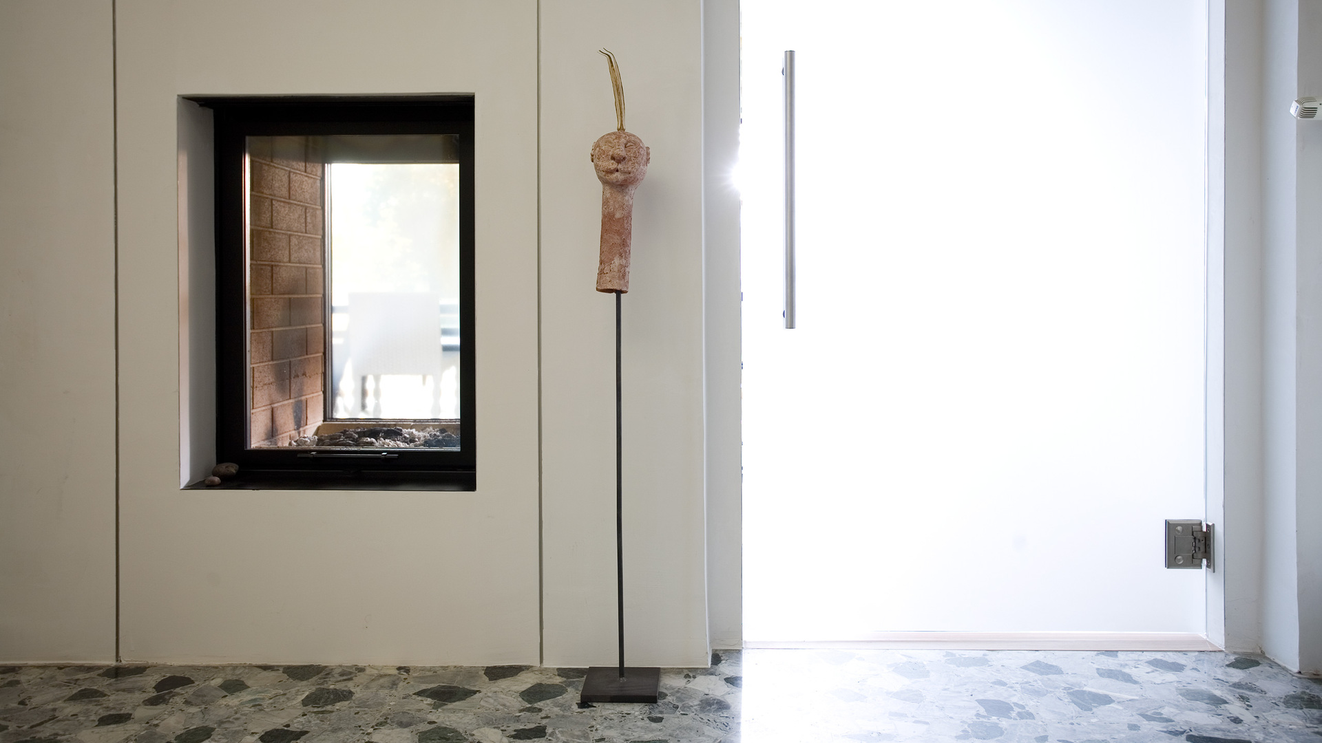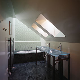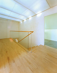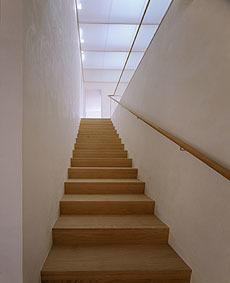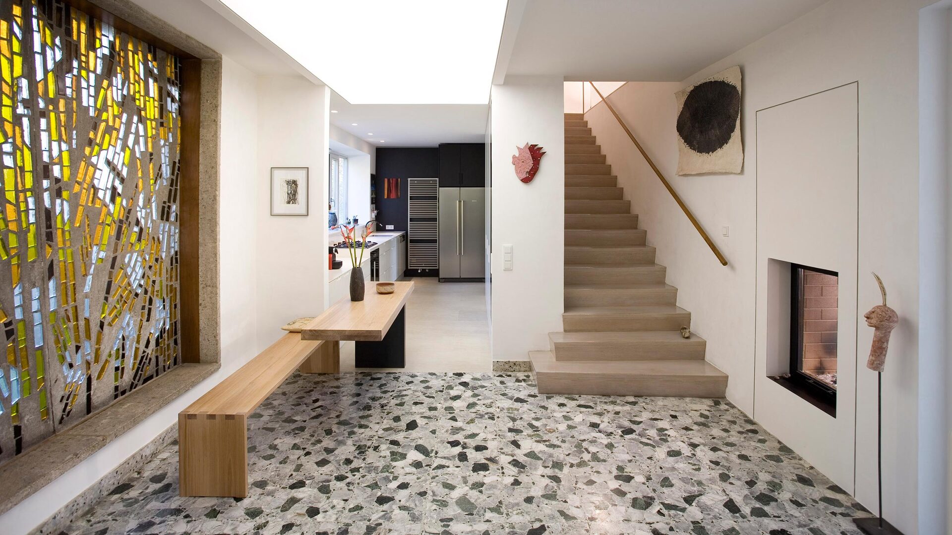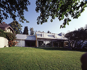 Straßenseitig wurden Dach- und Wandflächen außen gedämmt, hinterlüftet und einheitlich mit Edelstahlblech eingekleidet; der Garagenvorbau wurde original erhalten. Das Glas der Zaunfläche wurde zur weichen Texturierung eigens auf Sand geschmolzen. Gartenseitig wurde einen guten Meter vor dem bestehenden Aluportal eine neue Glasfassade aus Glasschiebewänden errichtet. Der entstehende Luftraum reguliert als „echter“ Wintergarten die sommerliche Überhitzung und den winterlichen Wärmeverlust. Das originale Aluglasportal konnte erhalten bleiben – beschattet durch die frei auskragende Pergola, belüftet durch kühle Zuluft aus dem Kellergeschoss und dachseitig entlüftet mittels durchgehendem Oberlichtband. Innen wurden im Dachgeschoss das Elternschlafzimmer mit Schrankraum, ein Gästzimmer, die Bibliothek, ein großes Bad und die zentrale Halle als Galerieraum geschaffen. Im Erdgeschoss wurde der Kindertrakt mit barrierefreiem Bad neu eingerichtet.