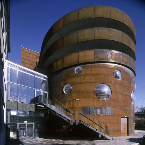 Lorenz hat seinen Bauherrn gleich zu Beginn mit Images von Schiffen konfrontiert. Gestrandeten Schiffen. Rostigen Schiffen. Und genauso steht der Neubau jetzt auch da. Breit und lang. Er hat eine ungemein signifikante Fassade aus Corten-Stahl, an der Längsseite jeweils einen runden Baukörper - die Wendelrampen zu beziehungsweise von den Parkdecks -, eine Fassade, in der Kunststoffkuppeln wie Bullaugen sitzen - kein neues Produkt, nur diesmal vertikal statt horizontal verwendet - und einen durchaus großzügigen, auch großstädtischen Vorplatz an der Ecke. Dort besteht die Fassade aus Glas - eine schlichte Pfosten-Riegel-Konstruktion - mit einer vorgeschalteten Aluminium-Lamellenschicht zur Beschattung, die auf einer Fläche von 22 mal 7,5 Metern zusätzlich als dynamischer Werbeträger (LED) fungiert.