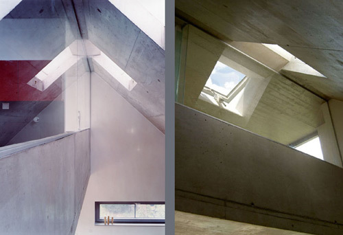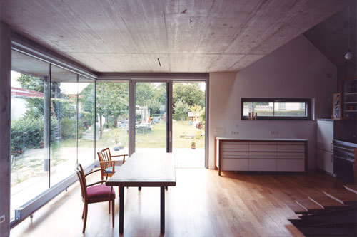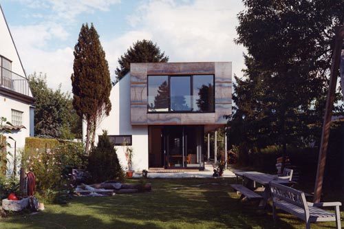 Auf dem sehr langen und schmalen (11,7 m) Grundstück in der Lobau machten sich die Architekten einen „versteckten“ Passus in der Wiener Bauordnung zunutze, der es ermöglicht, mit einer eingeschossigen Kubatur in einer Länge von 10 Metern direkt an die Grenze des Nachbargrundstücks zu rücken. „Die Ausnützung und Nutzbarkeit des Bauplatzes verbessert sich signifikant“, so die Architekten, „... und das Volumen des Baukörpers wird aus dieser Möglichkeit entwickelt.“ Was auf den ersten Blick wie der Ausbau eines anonymen Siedlerhauses anmuten mag, entpuppt sich so als eine im baubehördlichen Regelwerk optimierte Kubatur: Auf dem an die Grundgrenze gesetzten Erdgeschoss mit seitlicher 45 Grad-Dachneigung sitzt der in eine hinterlüftete Cortenstahl-Fassade gepackte Körper des Obergeschosses, der die Abstände zu den Grundgrenzen wahrt, und der dank seiner Auskragung an drei Seiten des Hauses überdeckte Freiräume schafft.Das low budget-Haus (Stahlbetonkonstruktion, innen Sichtbeton, nichttragende Zwischenwände aus Birkensperrholz) für eine Familie mit zwei Kindern stellt auf einer bebauten Fläche von 71 m² eine räumlich reizvoll organisierte Nutzfläche von 130 m² zur Verfügung, wobei unter der Dachneigung ein zweigeschossiger Luftraum die Stiege großzügig „umspielt“ und den ebenerdigen Wohnraum mit dem Zimmern im Obergeschoss verbindet. Der Projektname „überraschend rot“ spielt auf das farbliche Eigenleben der Stahlfassade an, die sich mit zunehmender Korrosion in ihrem Erscheinungsbild intensiviert. (Text: Gabriele Kaiser)