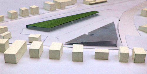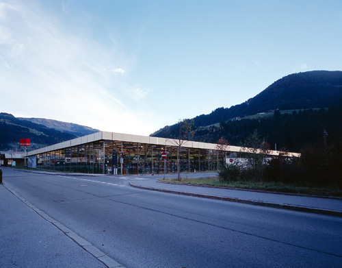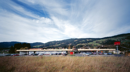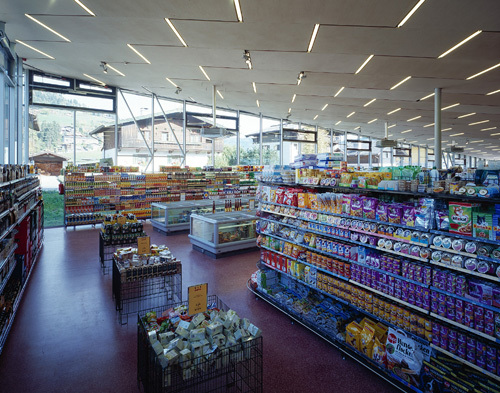 Das markante Dach, das zur Bundesstraße hin ansteigt, liegt nirgends flächig auf. Es wird nur von Stützen und wenigen, bewusst situierten Wandscheiben getragen, die der Aussteifung dienen. Als breites Band überdeckt die geradlinige Dachfläche das gesamte „Dreieck“ und überdacht den Freibereich des Baguette-Cafés sowie die Anlieferung, die sich auf der den angrenzenden Wohnbauten abgewandten Seite befindet. Ostseitig und in Richtung der Wohnbebauung orientiert befinden sich der Eingangsbereich und das Baguette-Café mit seiner Gastronomie, es entsteht ein „prominentes Eck“, das von der Zufahrt her gleich gesehen wird und zum Besuch einlädt. Die Parkplätze liegen von der Straße abgerückt zwischen dem Supermarkt und einem Gewerbebau. (nach einem Text des Architekten)
