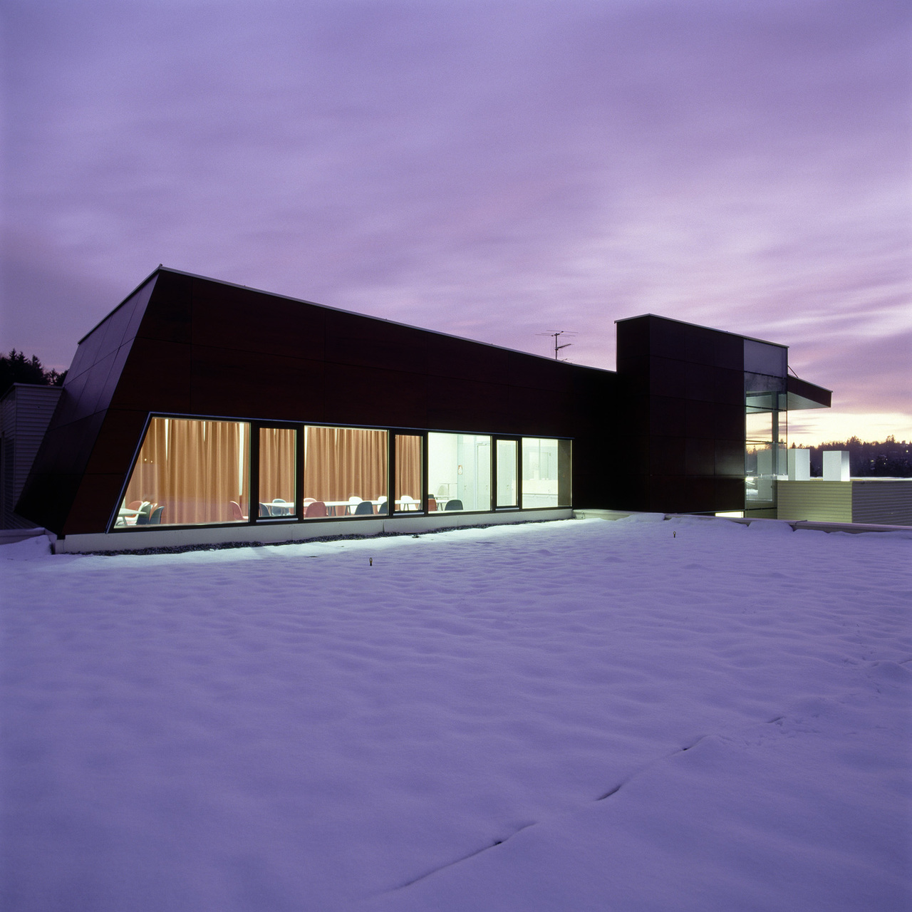 Die bestehende Gebäudehülle wurde mit der erforderlichen Fassadendämmung als hinterlüftete Blechfassade ausgeführt. Neue Bauteile wie der Liftturm erhielten eine transparente Glasfassade, die Wohnbereiche und Studierräume eine Holzplattenfassade. Raumhohe Fensterelemente erhöhen entscheidend die Lebensqualität. Sie konnten durch die obligatorisch erforderliche Brandmeldeanlage und die neue Aufteilung in größere Brandabschnitte ohne Einschränkungen durch den Brandüberschlag hergestellt werden.
