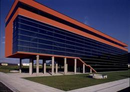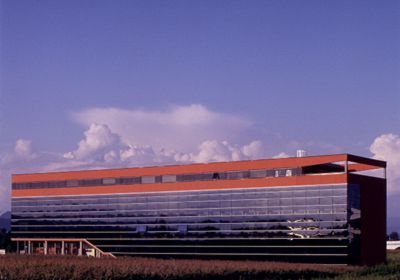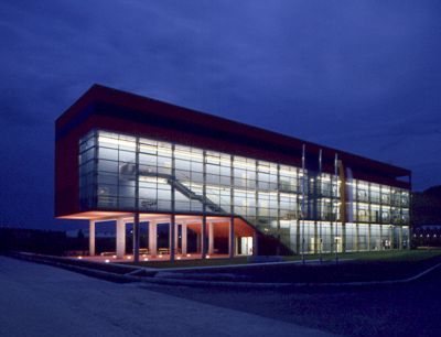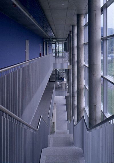 Auf Grund der unzureichenden Tragfähigkeit des Bodens wurde eine Pfahlgründung ohne Unterkellerung ausgeführt. Die Auskragung der Obergeschosse folgt der Unterkante des Hörsaals. Entlang dieser Neigung verläuft auch die einhüftige Erschließung, parallel zur Glasfassade über alle drei Ebenen. Sie schafft den direkten Bezug zwischen Innen und Aussen. Die Glasfläche sorgt für optimale Lichtverhältnisse im Inneren und bildet Aussen den Kontrast zur orangen Putzfassade. Die Innenräume sind stützenfrei ausgeführt, damit bei Änderungen an den Raumbedarf eine flexible Raumaufteilung möglich ist. (10.09.2001)