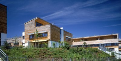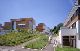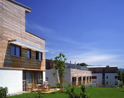 Das Grundkonzept der Bebauung umfasst drei unterschiedliche Typen, die nach den individuellen Anforderungen ausgebaut wurden: das Doppelhaus, das Reihenhaus und das Mehrfamilienhaus. Eine Art Baukasten-Modulsystem bildet die Basis, aus dem sich die einzelnen Variationen zusammensetzen. Damit wurden gezielte Änderungen bei einem einheitlichen Gesamtbild ermöglicht.