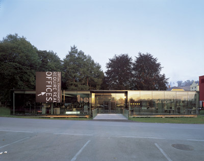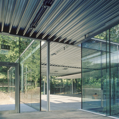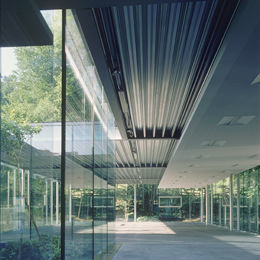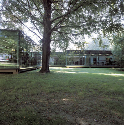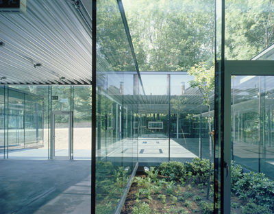 Auf diese Weise war es möglich, Atrien aus dem Volumen zu stanzen, die als „grüne Vitrinen“ zwischen die Büroräumlichkeiten geschoben sind und als omnipräsenter vegetativer Hintergrund als Gestaltungsmittel genügen. Das bewegte Licht- und Schattenspiel des Laubs sowie dessen Verfärbung im Rhythmus der Jahreszeiten bilden die inspirierende und kontemplative Kulisse für ein – von den Bauherren in diesem Sinne intendiertes – produktivitätssteigerndes Arbeiten im Grünen. (Text: Gabriele Kaiser, 14.05.2003)