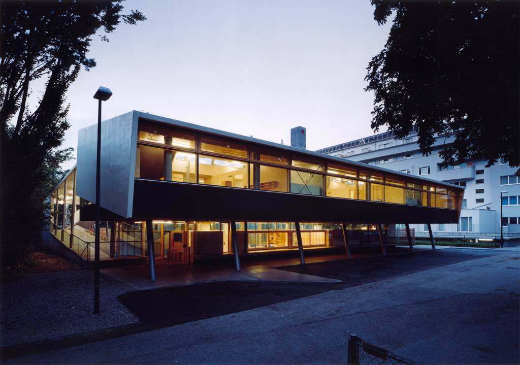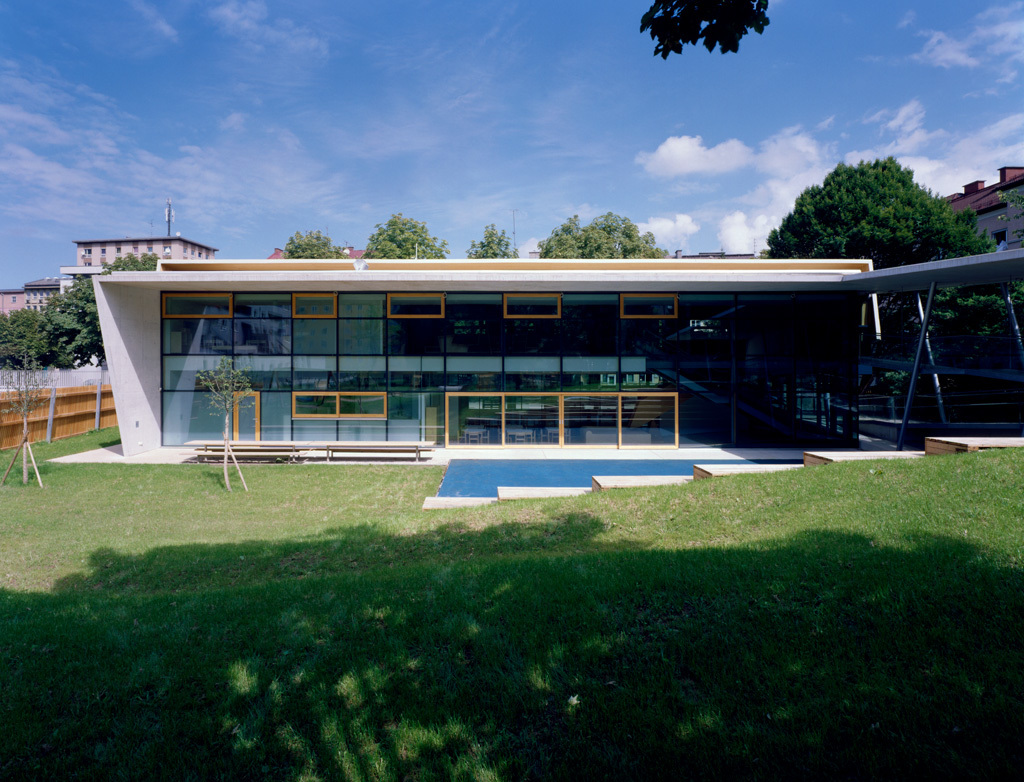 Der Kindergarten liegt am nordöstlichen, sonnigsten Platz einer grossen von Wohnbauten umringten öffentlichen Freifläche. Es ist der Ort mit der besten Übersicht. Als „Haus für Kinder“ trägt der zweigeschossige, leichte, luftige und gläserne Pavillon dazu bei, der innerstädtischen Wiesenfläche die Atmosphäre eines Parks zu verleihen. Das Gebäude ist in seiner Zeichenhaftigkeit als grosses benutzbares Spielzeug, als Summe miteinander verbundener Bausteine konzipiert und kommt der Erlebniswelt der Kinder mit vielfältigen Assoziationen und Phantasien nahe. Es will erlebt und erfahren werden.