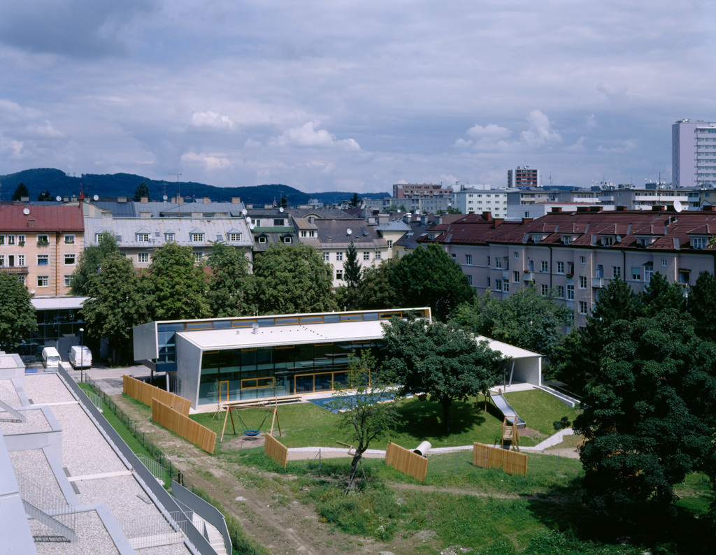 Dem Spiel- und Bewegungstrieb der Kinder wird u.a. mit einer steilen, langen Rutsche, die als „schneller Weg“ von oben nach unten führt, Rechnung getragen. Den zentralen Freibereich bildet ein befestigter, mit blauem Gummigranulat belegter Platz, der räumlich an drei Seiten gefasst ist und den Charakter eines arenaartigen Spielhofes hat, der in Verbindung mit der Rampenanlage und der Holztribüne als kleine Theateranlage für Aufführungen genutzt werden kann. Das Gebäude stellt ein einprägsames Element des Stadtteiles mit animativem Charakter dar, das die Tradition Salzburgs mit seinen Plätzen und Parklandschaften weiterschreibt. (Gabriele Kaiser nach einem Text der Architekten)